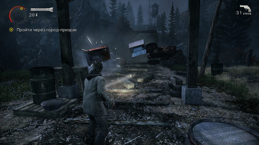 Но хватит о нарративе. Как же игра, собственно, играется? Большую часть времени нам предстоит блуждать в потёмках. Оно и понятно, ведь игра пытается быть хоррором. Почему пытается – объясню позже. Нашим основным вооружением выступает фонарик и какой-нибудь огнестрел: револьвер, дробовик, ружьё или ракетница. Ну и дополнительные приблуды: фальшфейер, чтобы отгонять врагов, и светошумовая граната, чтобы разом нанести большой урон нескольким недругам. Сами же противники представляют собой... людей. Буквально. Всякие строители, охотники, лесорубы и гопники. Короче говоря, работяги и простые граждане Брайт Фоллза. Но враждебно они настроены потому, что одержимы тьмой и внешне покрыты такой чёрной дымкой. Собственно, чтобы их победить, сперва нужно некоторое время светить на врага фонариком, чтобы сбросить с него эту самую дымку, а уже потом пускать в ход огнестрел. Именно так и выполнена вся боёвка в Alan Wake. Да, иногда нас атакуют одержимые стаи птиц или вовсе предметы, на полных скоростях летящие прямиком в лицо Алану, но и те и другие, опять же, побеждаются с помощью света.