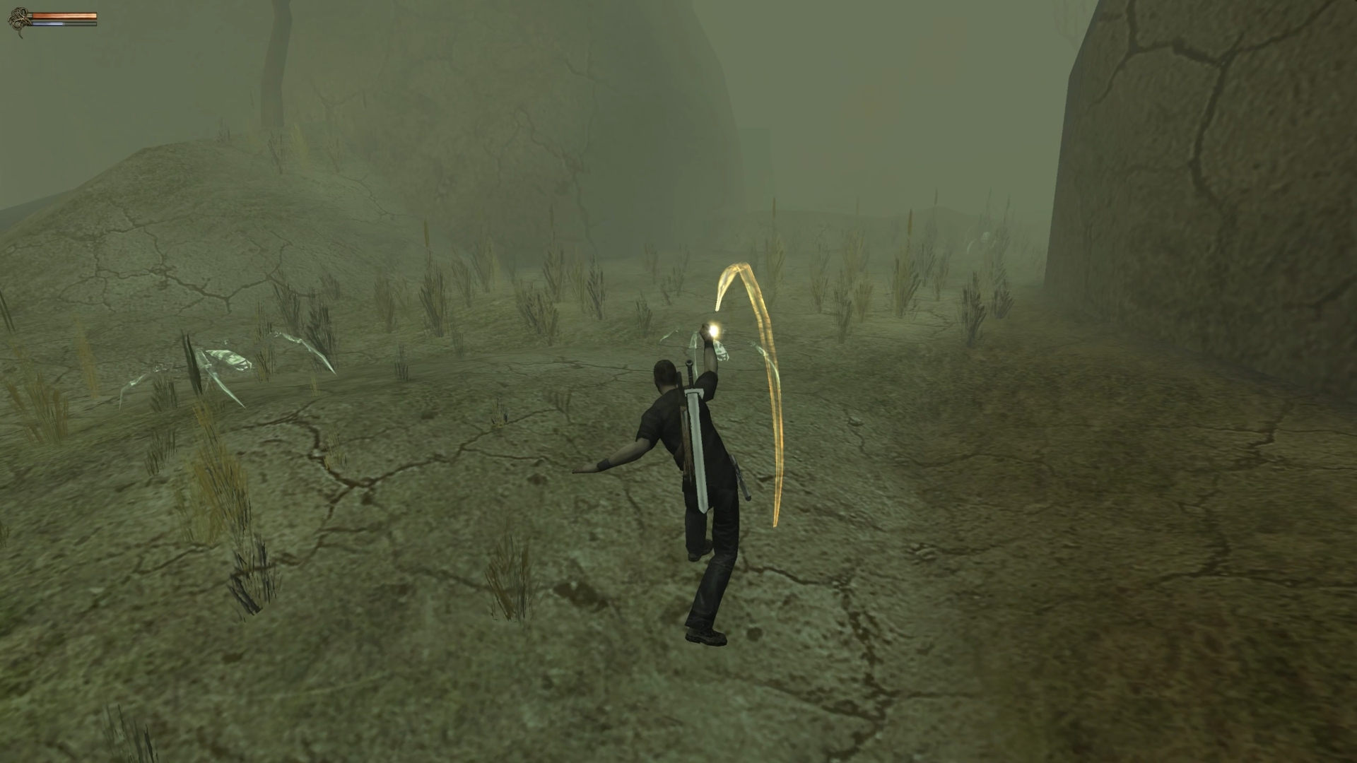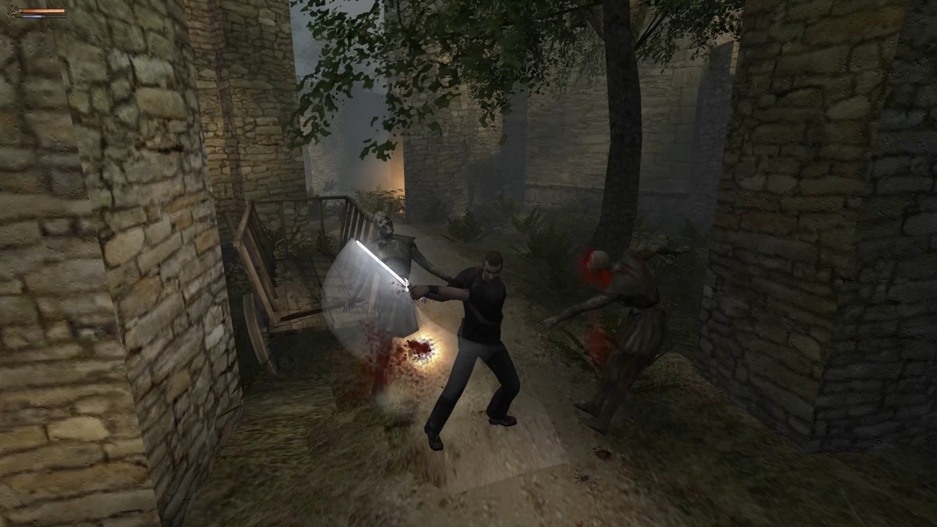Начну с того, что задушило больше всего и, признаюсь, наложило отпечаток на мое восприятие всего игрового процесса в негативном ключе. Речь идет о сражениях и боевой системе в частности. По началу, когда врагов немного, и это вялые мертвецы или скелеты, все вполне себе удобоваримо. Да - топорно, да - кривенько, но для 2004 г. более чем приемлемо. Чуть позднее появляются более сильные соперники: бьют больнее и сами впитывают немало урона. Наша джедайская сабля уже не так эффективно справляется и ковырять нежить приходится гораздо дольше. Более того, чаще всего схватки превращаются в битву дерганных болванчиков, когда персонаж, находясь в непосредственной близи с врагом, вместо ударов холодным оружием начинает его пинать и боксировать кулаками. Противник конвульсирует в ответ, анимации ударов обоих периодически прерываются, по игроку все равно засчитывается урон, и это безобразие продолжается до геймовера или нашей победы. А теперь представьте, что против вас выходит не один такой супостат, а два и больше. Они все вас окружают и нещадно начинают затыкивать со всех сторон так, что даже блок не помогает, потому что дамаг в защите все равно проходит.