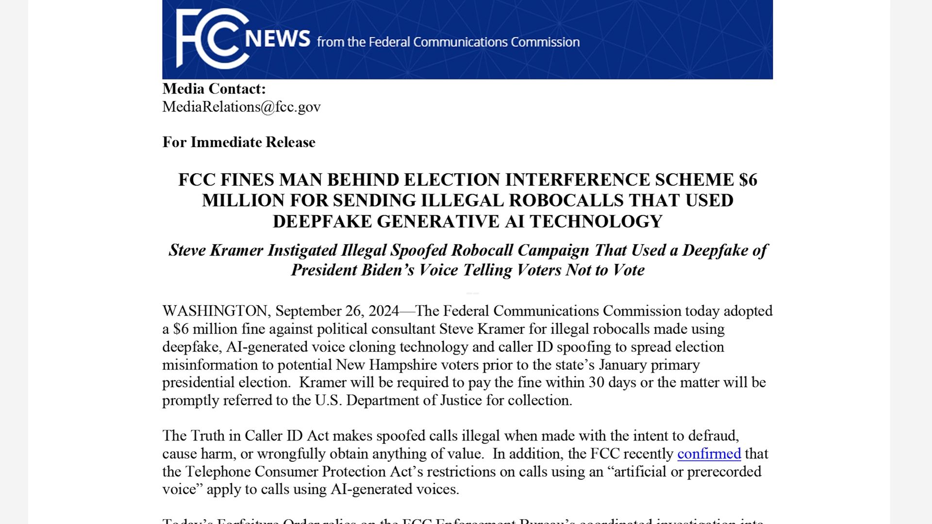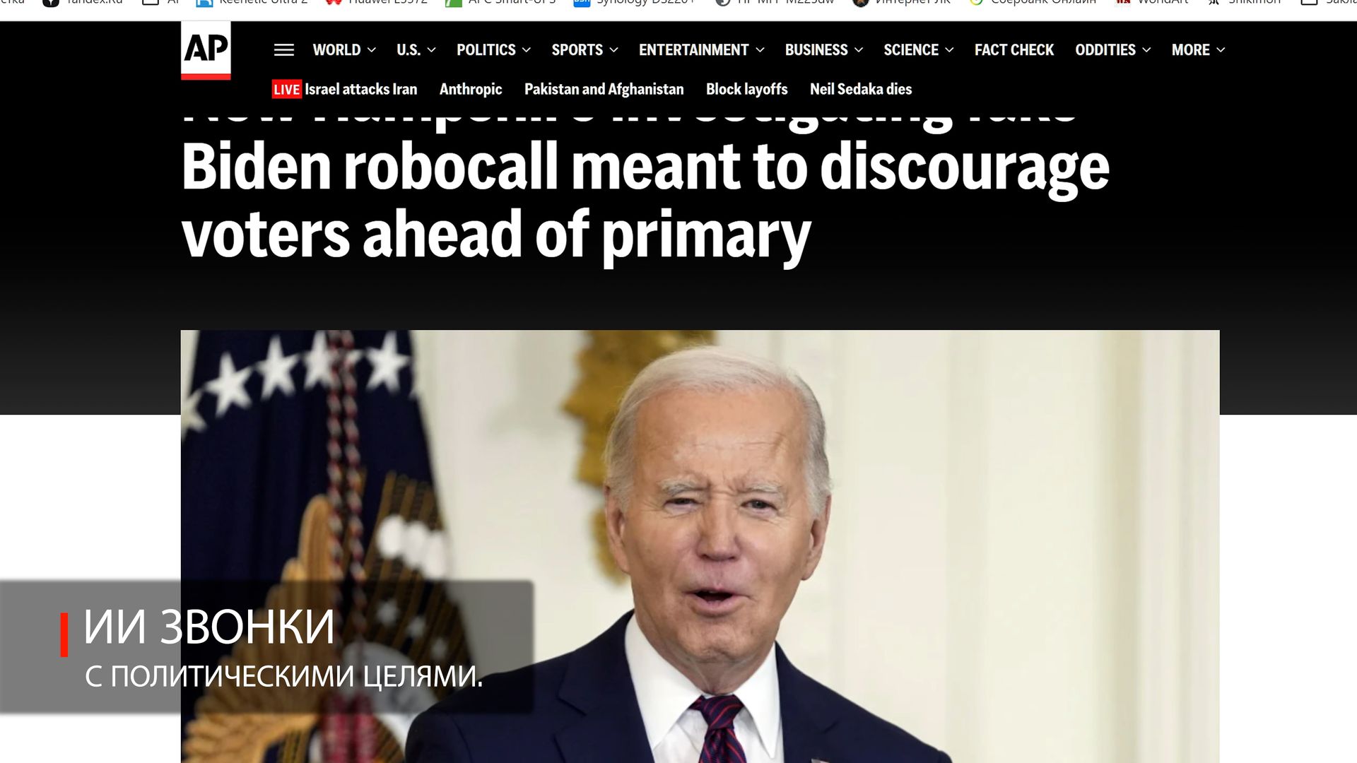 Например, в январе 2024 года избирателям в американском штате Нью-Гэмпшир пришли звонки от ИИ-ботов с синтезированным «голосом» Джо Байдена, которые убеждали людей не идти на праймериз; позже Федеральная комиссия по связи США назначила организатору многомиллионный штраф — и этот кейс стал наглядным примером того, как deepfake уже превращается в реальные политтехнологии. [Источники]