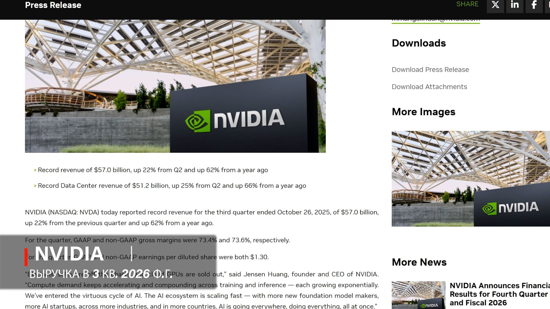И это видно в цифрах поставщиков. Например, у Nvidia дата‑центровая выручка в 3 квартале 2026 финансового года выросла до рекордных значений и стала доминирующей частью бизнеса, а сама компания публично описывала спрос на AI‑ускорители как ситуацию «продаём всё, что успеваем произвести». [Источник]