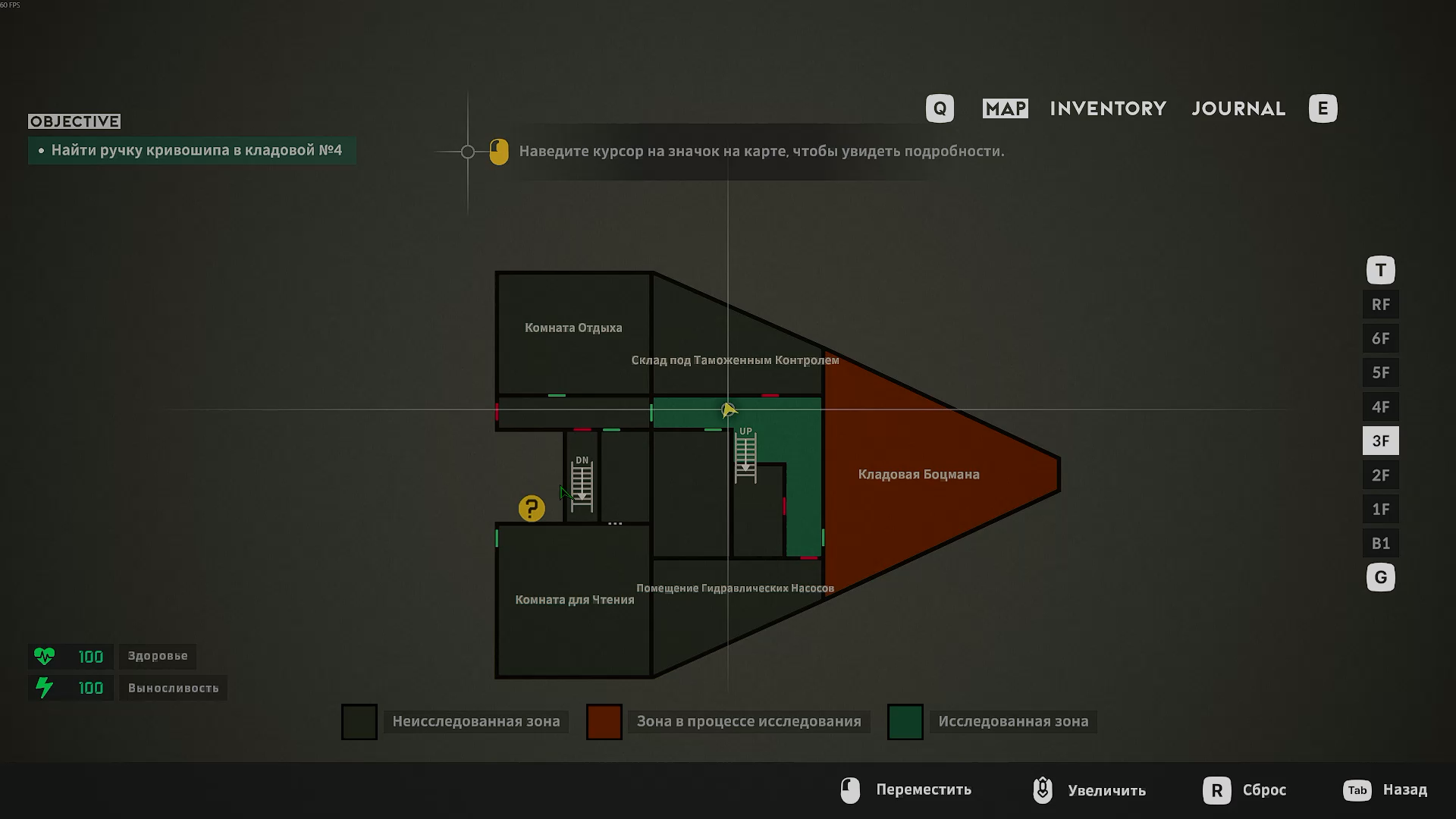 Построена карта по принципу упомянутого выше Резика. Неисследованные места отмечаются серым цветом, исследованные, но не полностью залутанные — коричнево-красным, а места, где всё собрано — зелёным. Это удобно. А вот, что мне не понравилось — на карте отмечены места с лутом (во всяком случае, с деньгами). Карту, кстати, для разных этажей нужно находить отдельно. Но она всегда расположена на видном месте, на стене где-нибудь в центральном коридоре этажа.
