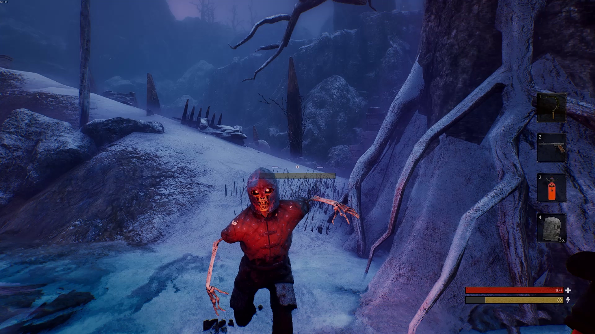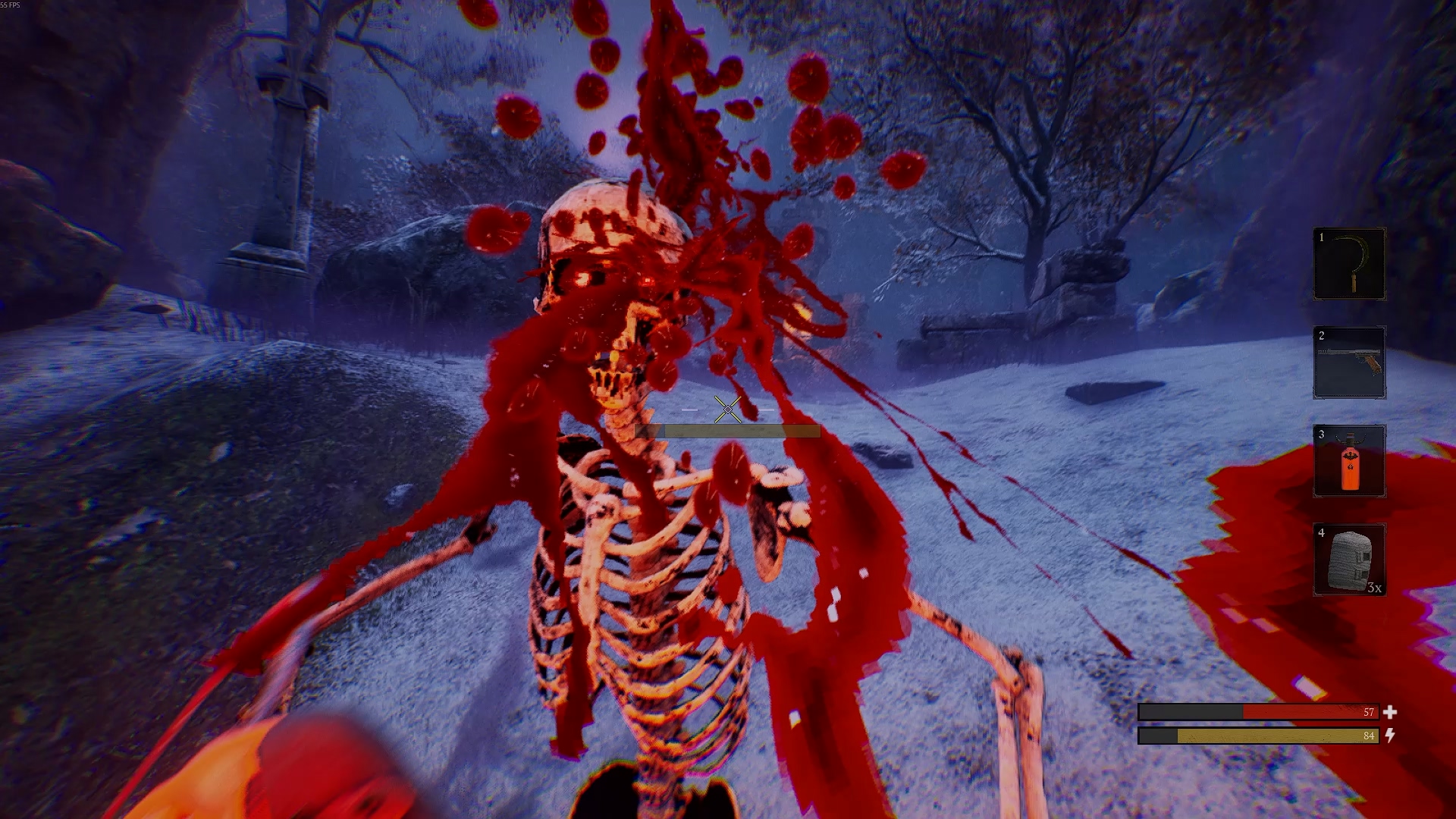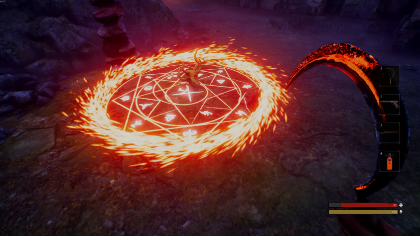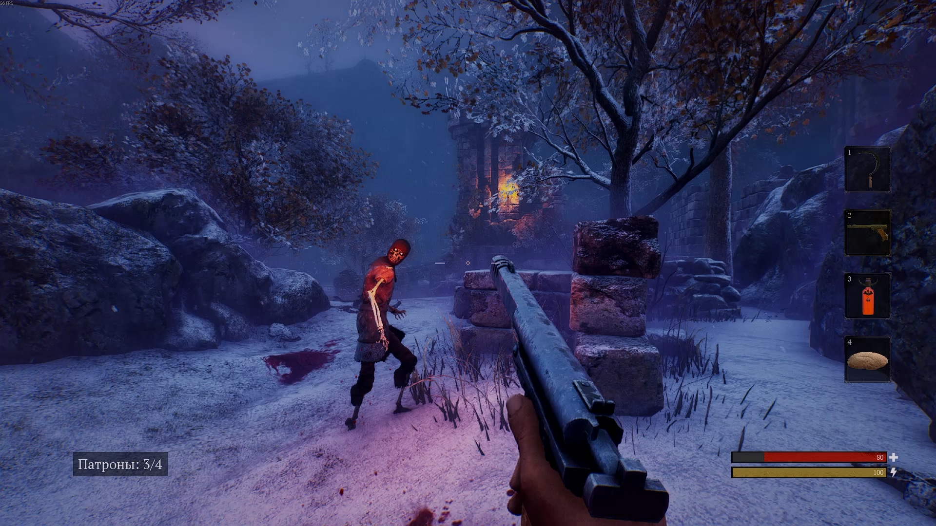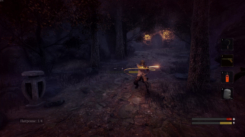 Оружия я обнаружил, кажется, 3 пухи для ближнего боя и 3 для дальнего. Что для демоверсии вполне неплохо. Хотя испытал я лишь половину из всего этого — серп, пистолет и винтовку. Не успел попробовать — кинжал, топор и гримуар. Последний — это магическая книга, которая не тратит боеприпасов, но значительно расходует стамину.