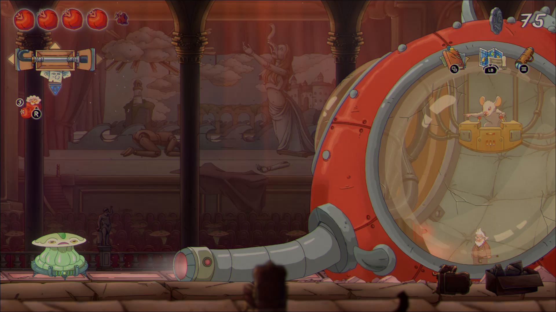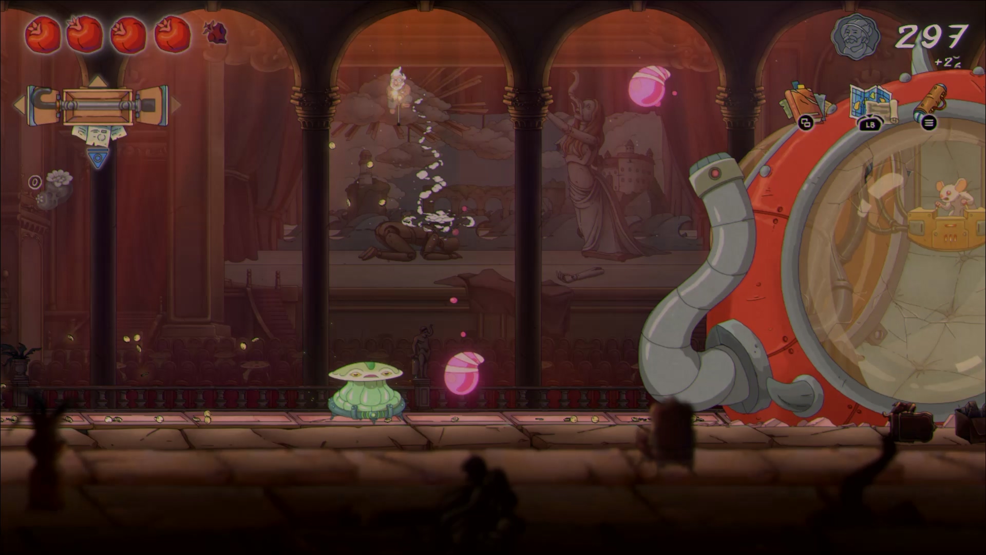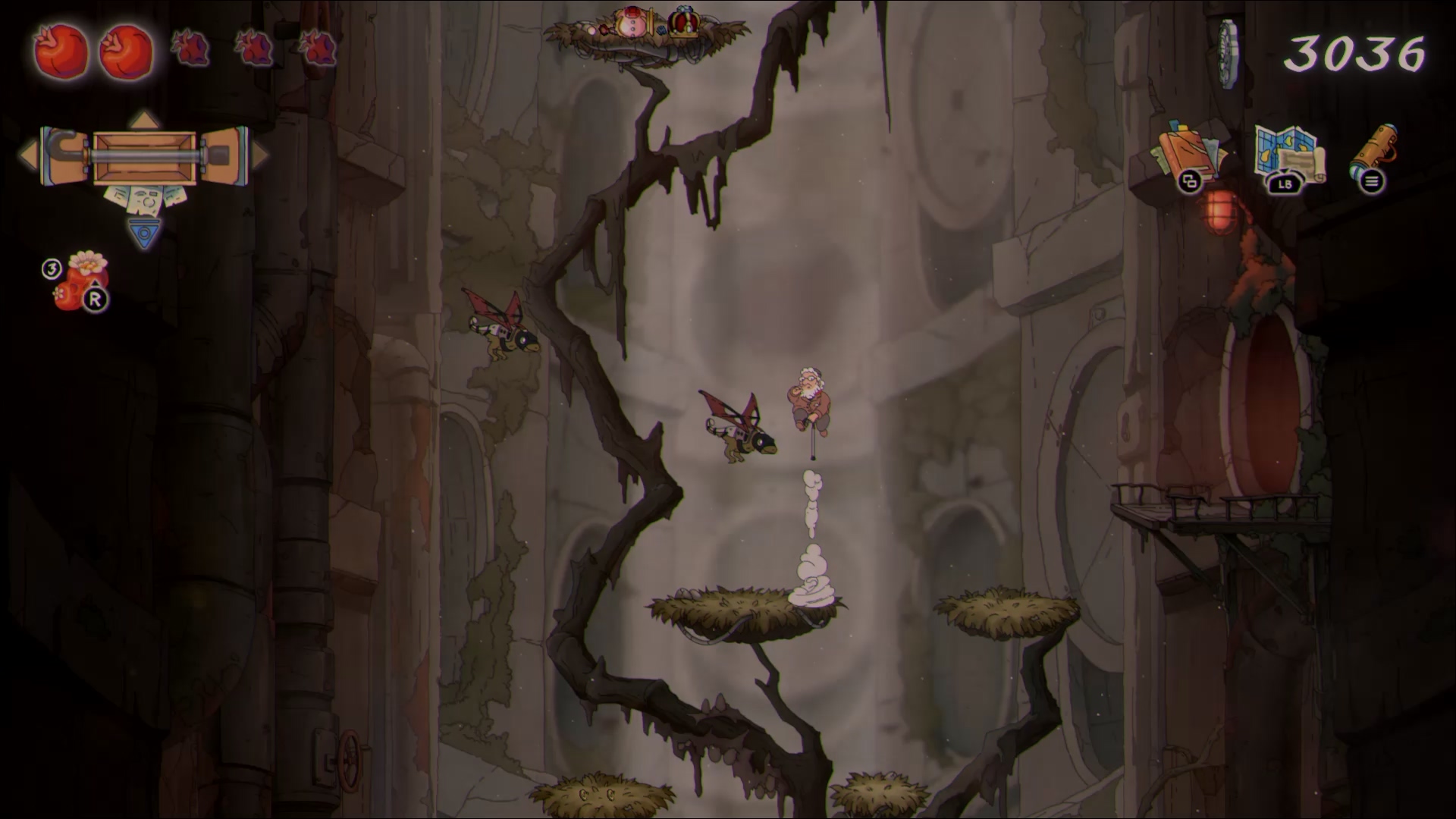 Что ещё любопытно — элементы трости можно менять взад-назад в любой момент. Например, бывают моменты, когда высокий прыжок не помогает, а мешает, не позволяя пропрыгать без урона в узком туннеле с шипами на потолке.