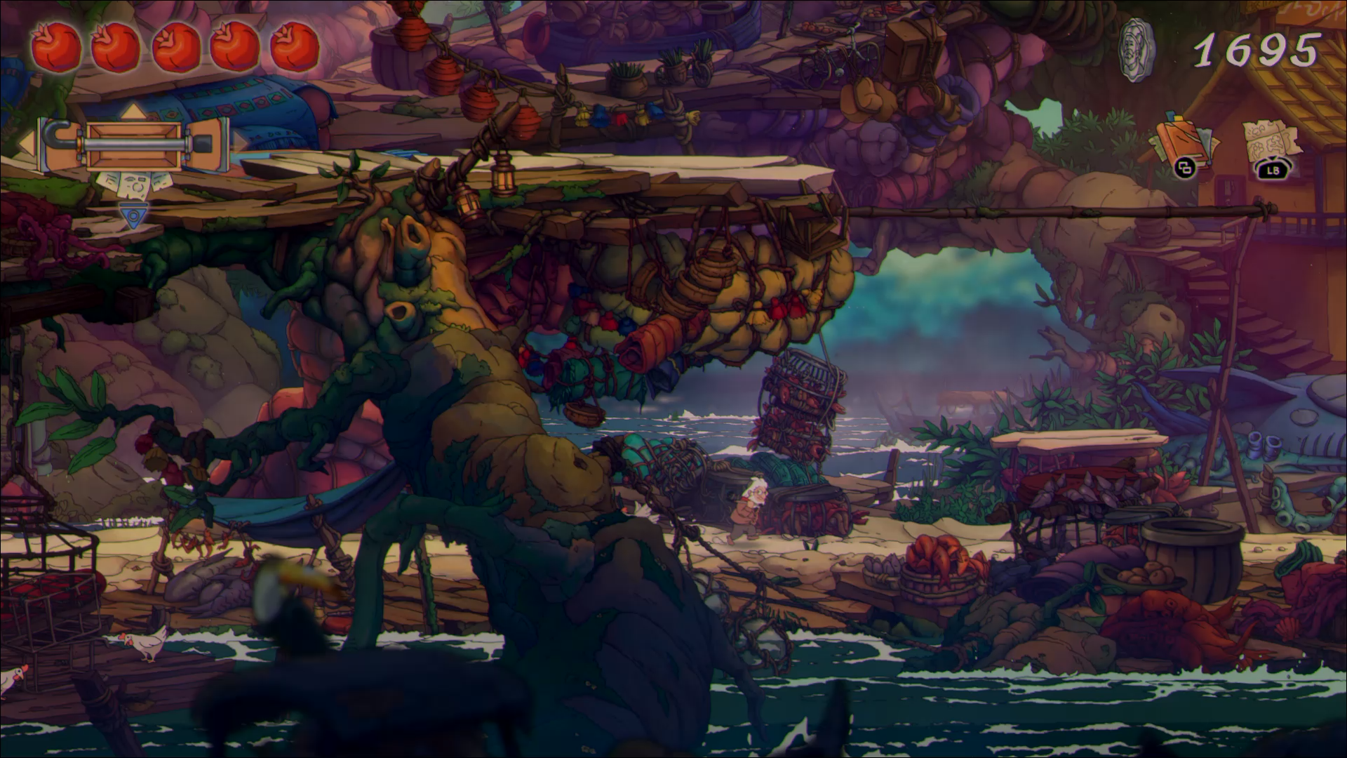 Восстанавливать утраченные очки здоровья, которые показаны здесь не привычной полоской ХП, а сердечками, которые снимаются по штуке за попадание, приходится едой, которую мы находим на локации и которую можно в каком-то количестве таскать с собой. Впрочем, я не заметил в ней особого смысла, так как после смерти, нас воскрешает рядом с последней ареной и с полным здоровьем. Так что, даже если вы пришли сюда на последнем издыхании и погибли, то вас возродит рядышком с фулл-ХП.