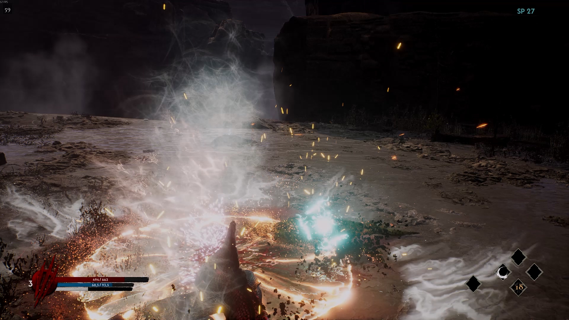 Казалось бы, для атаки у нас есть одна кнопка, не считая навыков, расходующих ману. Но используется она очень разнообразно. Базовое комбо, чуть отличающееся комбо, если после первого удара сделать паузу, удар с подбрасыванием, удар после переката и удар с прыжком вперёд, если нажать одновременно атаку и перекат, заряженный удар и заряженный удар в падении. Кроме этого есть блок и идеальный блок с возможностью контратаки. И также обычные атаки тоже имеют свойство парирования, как в Hollow Knight и даже могут отбивать снаряды обратно в противников.