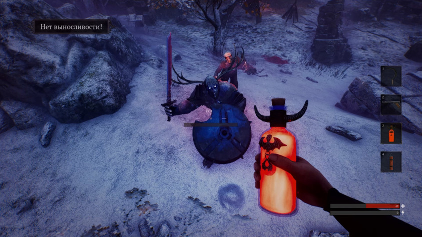 И да, здесь есть механика выносливости, которая заметно влияет на игровой процесс и за расходом которой следует следить. Расходуется она больше в ближнем бою, но иногда приходится и быстренько убегать от превосходящих сил противника или уворачиваться от них рывком.