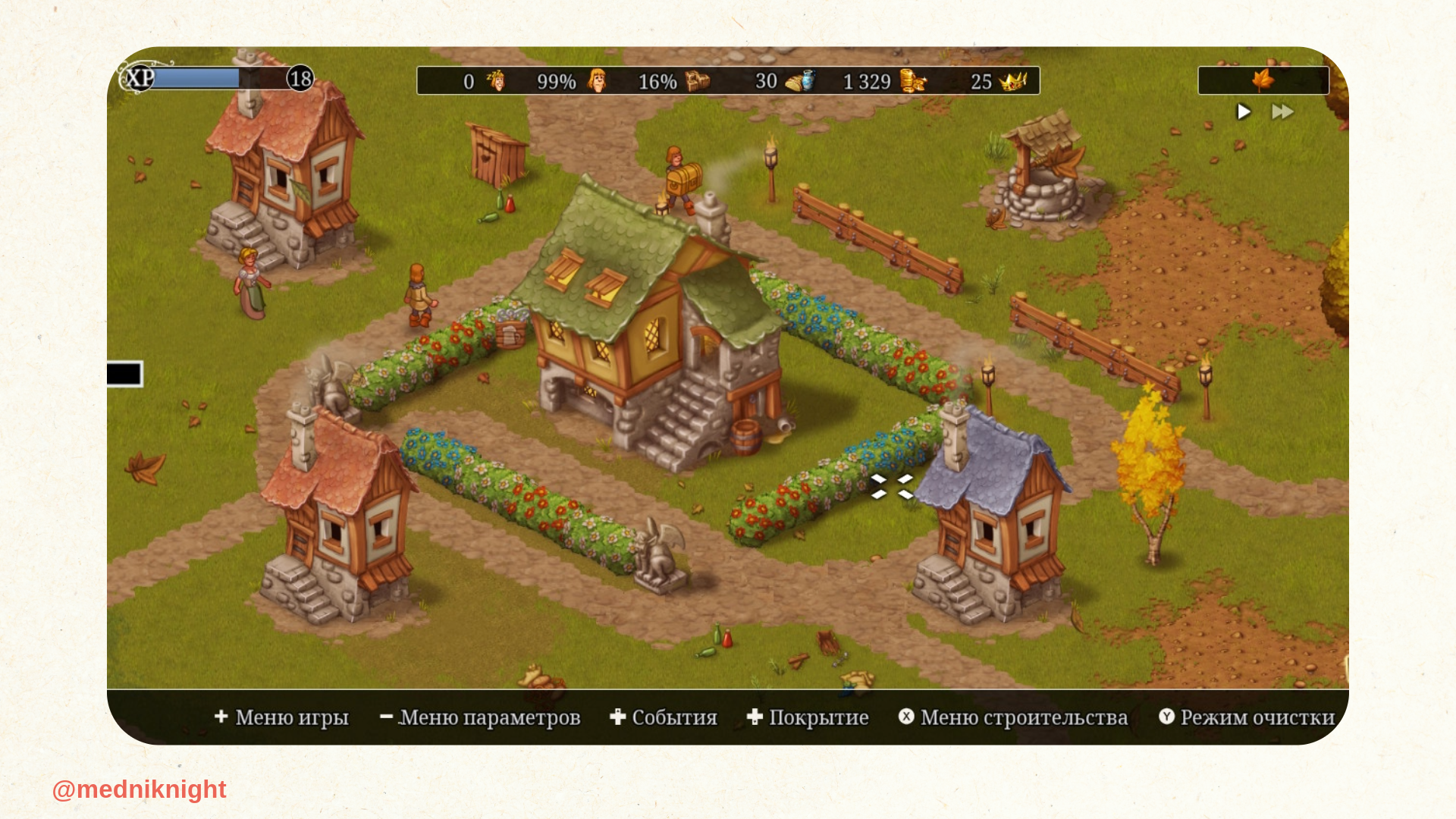 Внешний вид домиков, жителей в разных костюмах, иконки — дизайн не кричит тебе в экран «Тут уютно!», как некоторые игры жанра cozy. Вместо этого Townsmen предлагает красоту и эстетическое наслаждение без намерения эксплуатировать тягу уставшего геймера к чему-то расслабляющему. Даже те сценарии, которые позиционируются как истории с низким уровнем сложности, потребуют от вас тщательного выполнения рутинных задач и постоянного масштабирования. Отложить в сторону геймпад и позволить городу разбираться со своими проблемами самостоятельно не получится. Такой подход кажется мне прозрачным и честным.