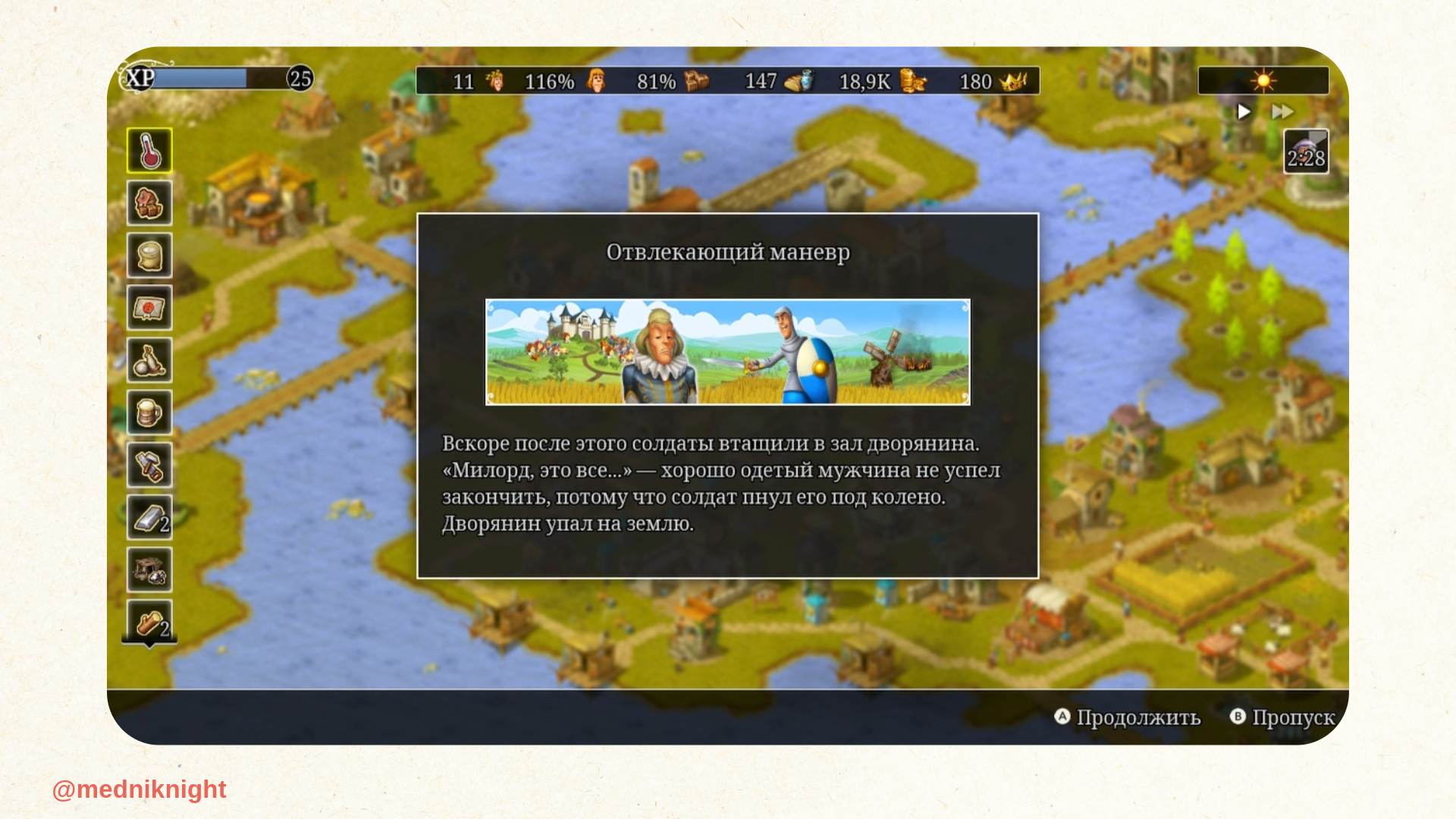 Если же по завершению сценария вы прикипите к построенному Городищенску, то специально для вас разработчики предусмотрели возможность перехода в бесконечный режим. Игрок не будет ощущать себя брошенным после праздника. Даже по окончании сюжета вам будут регулярно поступать разного рода задания. Чаще всего, это будут банальные запросы на дань, отражение набегов и выполнение статистических условий, как уровень удовлетворённости граждан. Но иногда случаются внезапные квесты с выборами и последствиями. Например, совершенно случайно я наткнулся на такую историю. Дворянин уничтожил целую ферму, которая раньше принадлежала уважаемому человеку из города. Естественно, народ и в частности сын того самого человека оказались возмущены кощунством дворянина. Однако тот имел полное право распоряжаться этой землёй по своему усмотрению, ведь как раз недавно он приобрёл территорию фермы. В этом сложном вопросе — поступить по закону или поступить по совести, — я выбрал второй вариант. Дворянина осудили, горожане остались довольны. Правда, совсем скоро обо всём случившемся в Городищенске прознал знакомый купец. И в ответ на нарушение прав собственности накинул на меня санкций в виде сорокаминутного запрета на торговлю с ним.
