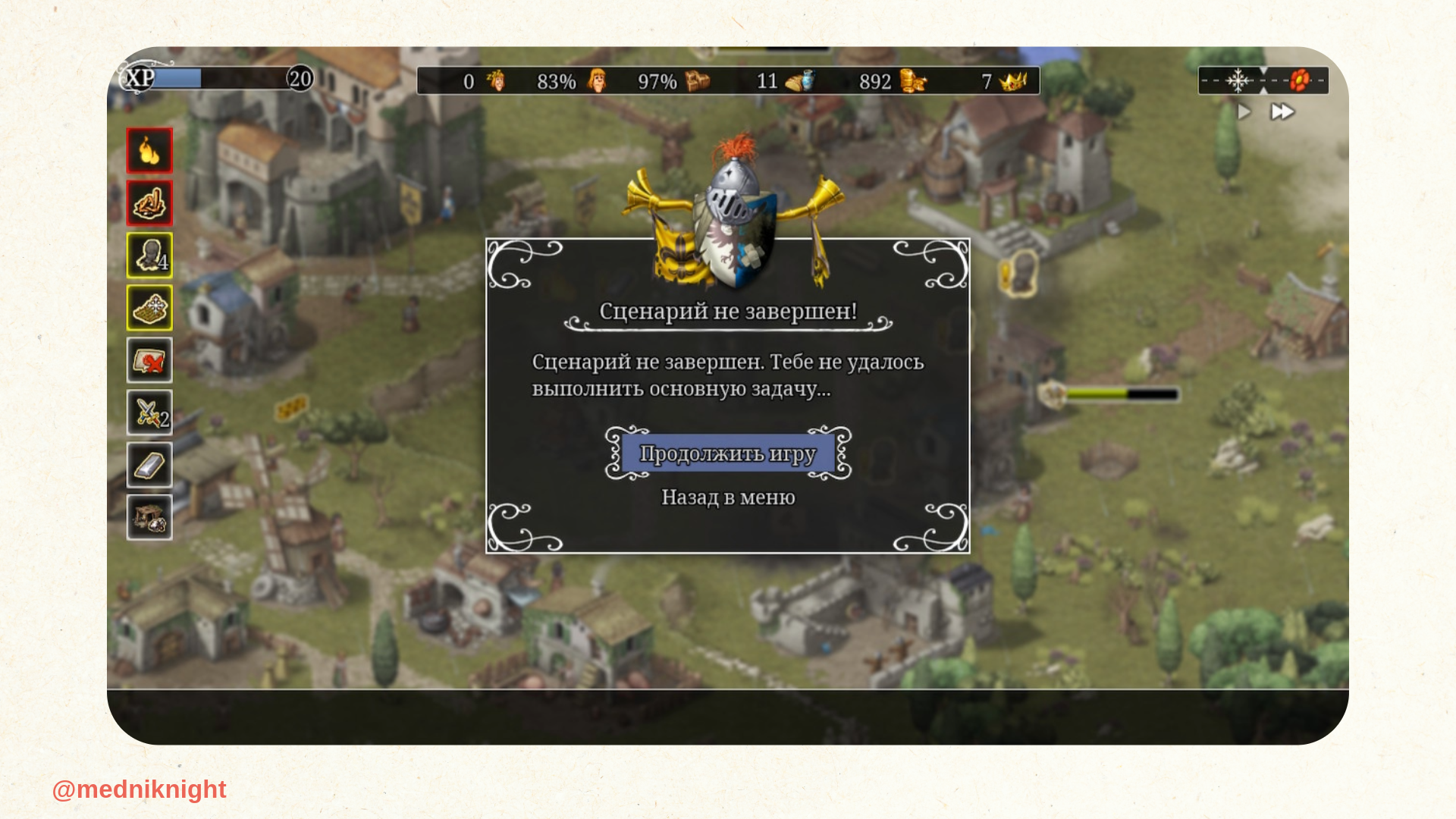 Ключевое в этом сценарии — ограничение по времени. На всё про всё отводится чуть больше двадцати внутриигровых минут. Не успели выполнить испытания за сезон? Начинайте сначала. Каждое действие должно быть рациональным, обдуманным и, что главное, своевременным. Ресурсы сильно ограниченны, а поэтому по привычке вкладываться во всё и сразу не получится. К тому же это был единственный сценарий, где я проиграл пару партий, и где народ взбунтовался против меня. Хотя казалось бы, я им собор вообще-то построил...