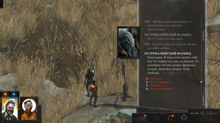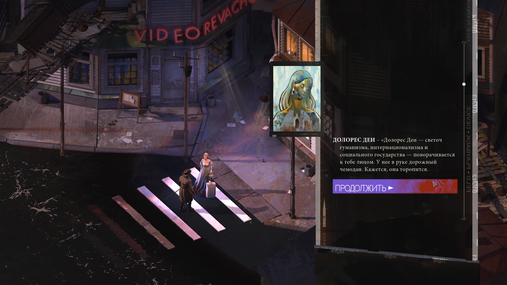 И эту идею прекрасно отражают три диалога из финала Disco Elysium, которые полностью написал Роберт. Первый из них происходит, когда Дюбуа проваливается в сон и видит Долорес Деи — могущественную историческую правительницу Ревашоля, почитаемую как Невинность. Она говорит о том, что цепляться за прошлое бесполезно, что попытки вернуть навсегда утраченное не принесут ничего, кроме боли.