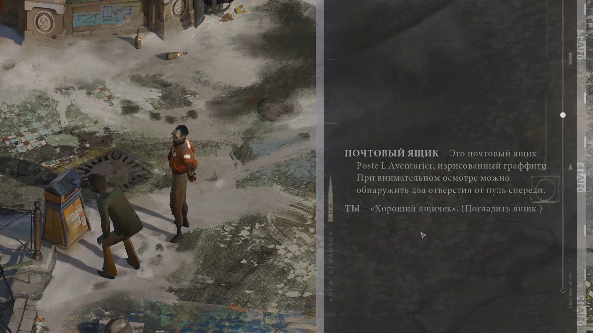 И, мне кажется, Disco Elysium — как раз одна из тех игр, которая буквально пронизана рассуждениями на эту тему. Ведь о чём вообще проект от эстонской студии ZA/UM (откуда ушёл основной костяк разработчиков после наверняка известного вам скандала)? О расследовании загадочного убийства? О выборе идеологии и убеждений с параллельным изучением лора Элизиума? Или, может, о комичном алкоголике, что предлагает первой попавшейся женщине «перечпокнуться», клянчит у всех деньги и разговаривает с неодушевлёнными предметами вроде почтового ящика? Ответ: да, да и ещё раз да. Но конкретно для меня на первый план выходит личная трагедия главного героя.