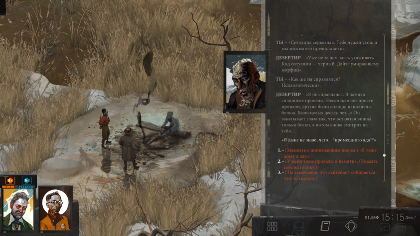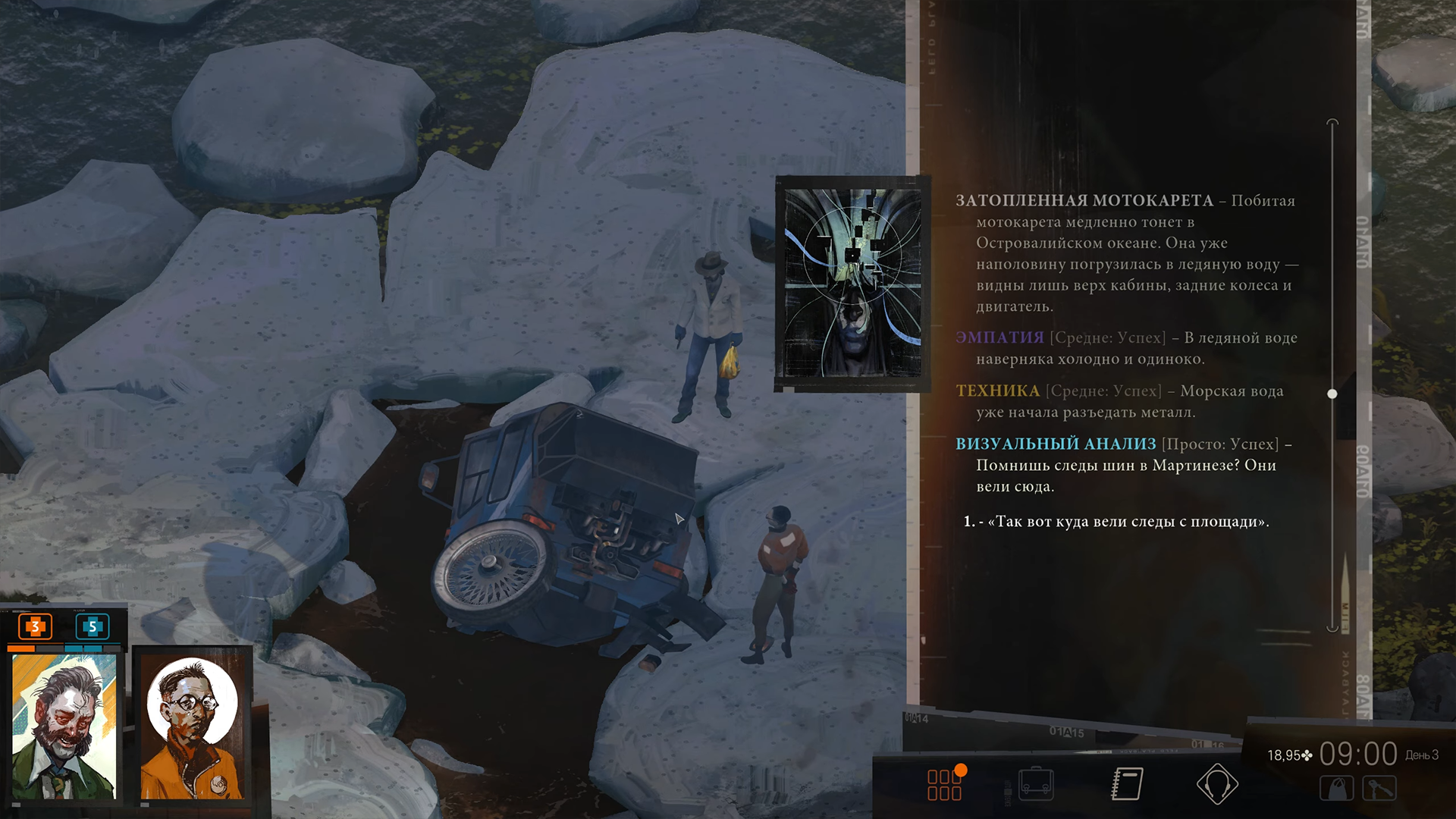 Мда-а… Атмосфера безрадостная… Аж хочется включить «Грусть FM» и начать тосковать, не правда ли? Но вообще-то и в Disco Elysium, и в истории Курвица сама боль от неудачи не является первостепенной. В «дискаче» разрыв с любимой женщиной и последующие за ним выходки случились ещё до событий игры. И потому огромное внимание на себя перетягивает другой аспект — процесс преодоления перенесённого горя.