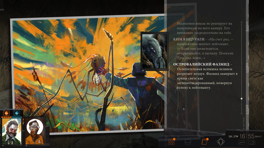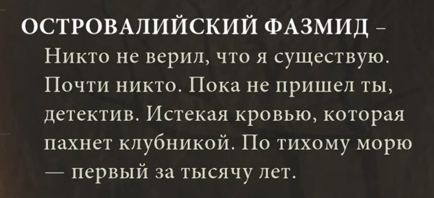 С другой стороны, если сохранять веру до последнего и полностью выполнить квест криптозоолога, твои старания окупятся в стократном размере. Так, прослушав эмоционально выматывающий разговор с дезертиром, насквозь пропитанный чувством опустошения, ты внезапно замечаешь его — Островалийского фазмида, за которым столько гонялся. И величиной он не с ладонь, как упоминал Морелл. Это самое что ни на есть гигантище.