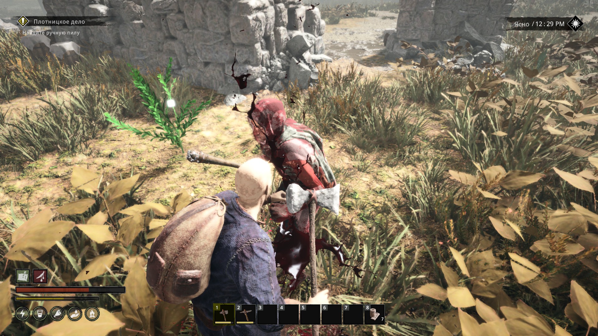 👍 Хорошая выживательная часть. С количеством ресурсов и условными таймерами голода/жажды не душат. При этом, у героя много жизненных параметров, которые важны.
