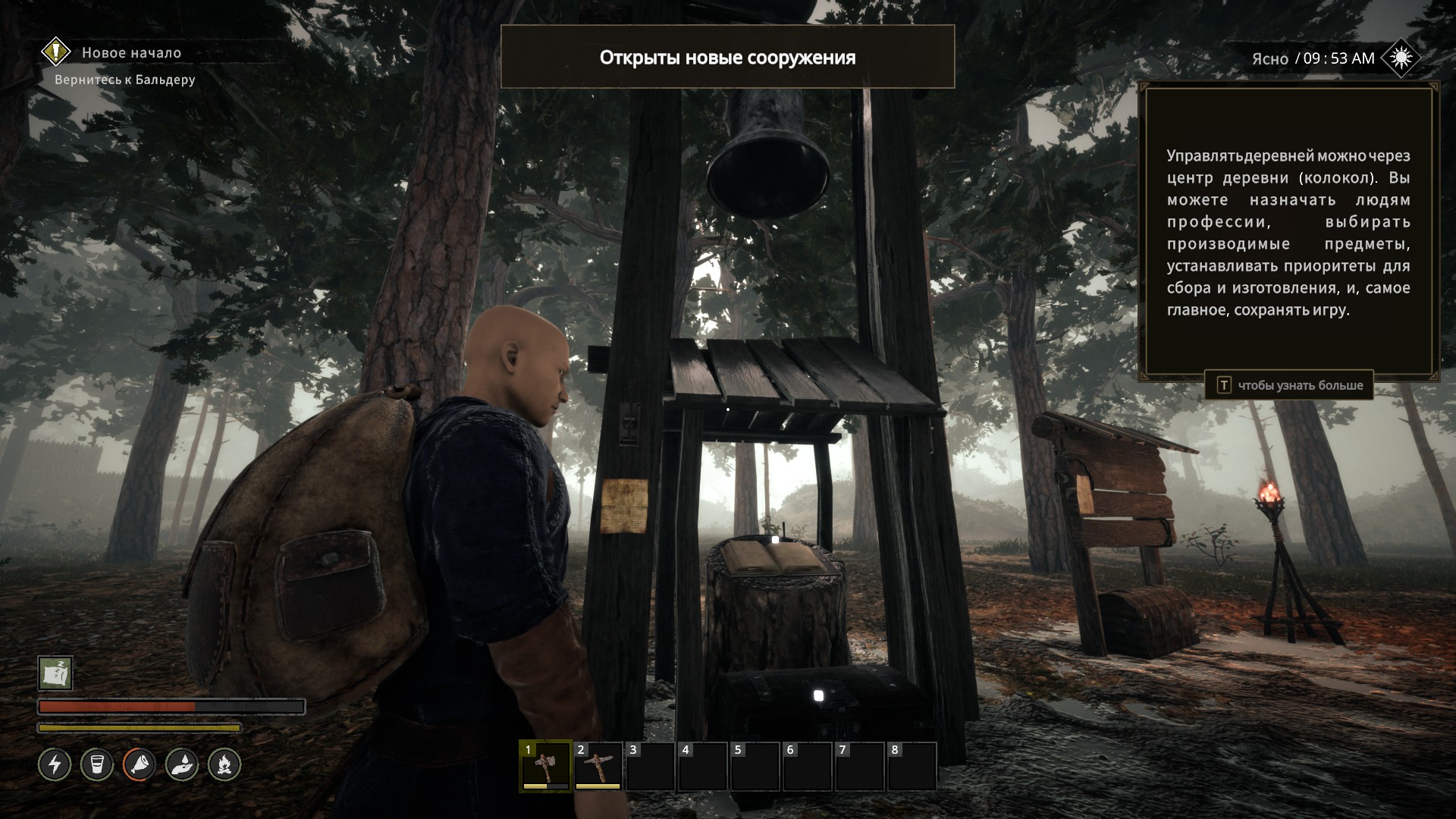 С героем немного другая история. Она скорее про удобство крафта. В игре вагон видов ресурсов и все они накапливаются и накапливаются в разных сундуках. Крафтовые станции ресурсы "подхватывают", а вот если что-то надо сделать лично, то придётся прямо в инвентарь положить нужные ресы. С одной стороны — логично. С другой — было бы веселее, если бы учитывались все сундуки деревни, раз уж герой всё равно тут.