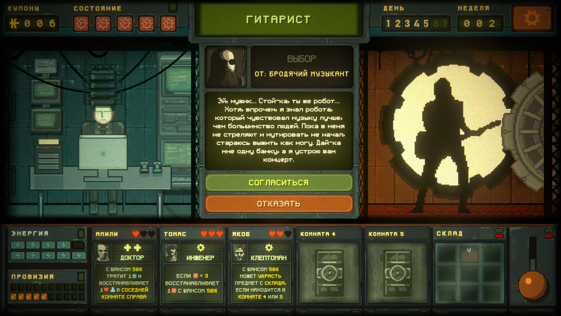 Симулятор принятия решений в антураже Убежища 33. Играть предстоит за УЗЕЛ — робота, который управляет бункером в разгар ядерного кризиса. Каждый день происходят какие-то события, на них надо реагировать и следить за параметрами. Главный параметр, конечно, Выжившие — население бункера со своими перками и навыками, вроде бить в морду соседу с вероятностью 30% или чинить механизмы. Перки срабатывают каждый день, навыки нужны для событий, медик мне вот так и не пригодилась (и бесславно отъехала с голодухи, когда бункер выставили рейдеры, которых принял за выживших другой жилец, слив им наши координаты).