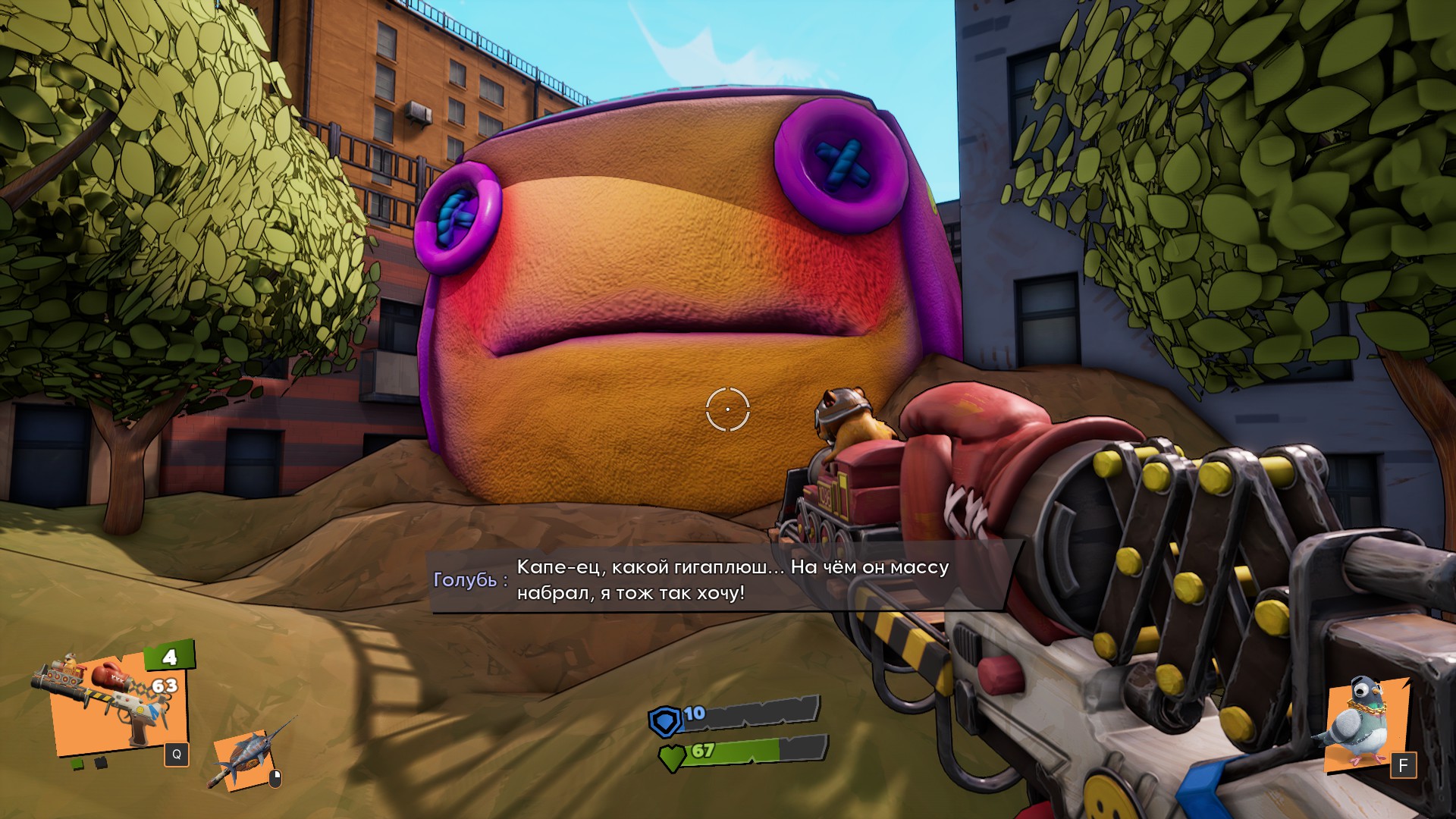 А главная фишка — напарник Голубь, который собственно… конкретный такой голубь в очках и с золотой цепью на шее. Болтливый комедийный сайдкик, комментирующий происходящее в неповторимой манере. Слабоумие и отвага? Нет, полное отсутствие мозгов (ну, он же голубь) и экзальтация от собственной крутости. Как шутер не очень, а вот шиза хорошая.