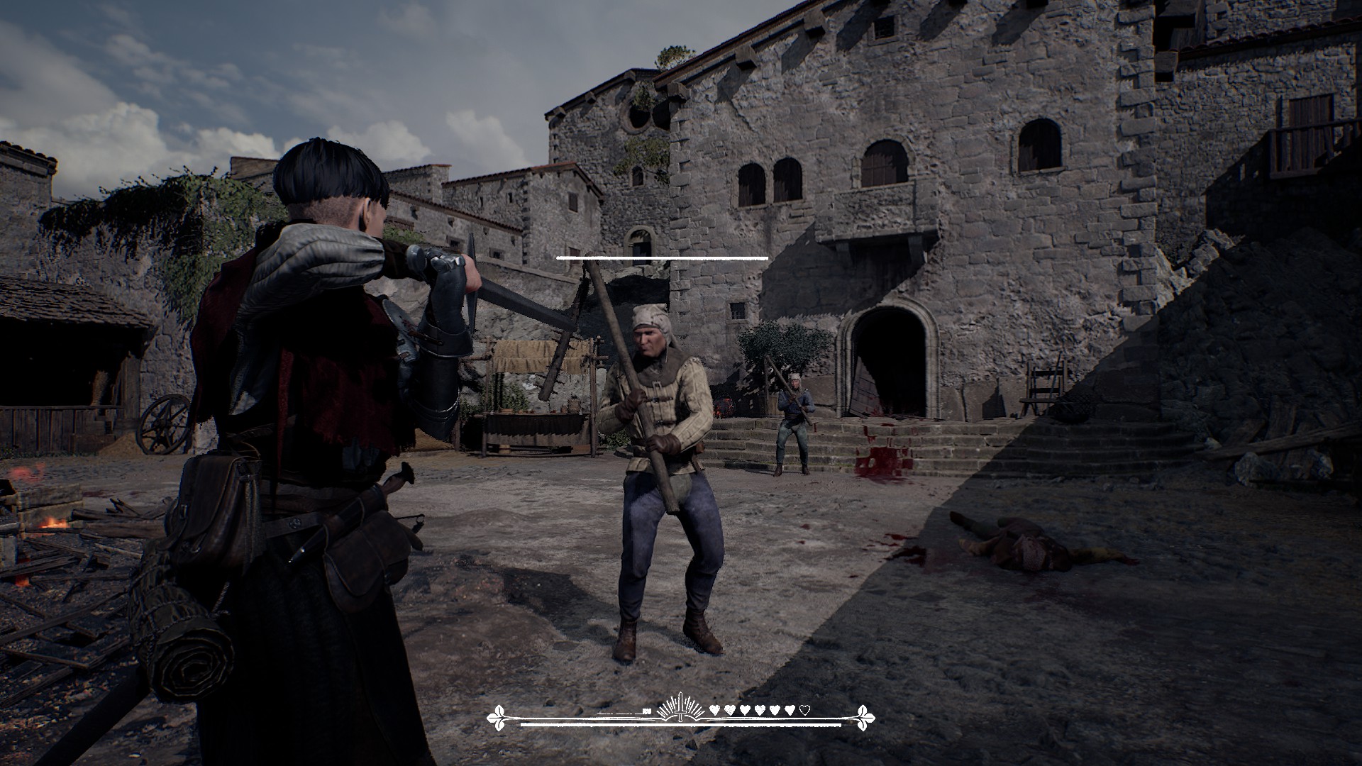Бедненько, но честно. Рыцарский экшен про поединки на мечах в средневековой Италии. Про Италию, честно скажу, если бы не знал, ни за что бы не догадался. Гамма у игры тусклая, «реалистично»-серая и никакого буйства красок, ожидаемого мною от столь южных и теплых краев. Зато поединки в наличие. В обучении, которое и составляет демо игры, все враги настолько любезны, что атакуют героиню только по одному, даже если на арене их несколько. Остальные смирно ждут своей очереди. Только это меня и спасало всю дорогу, боевка здесь своеобразная и непривычная: вначале надо долго выбивать оппоненту выносливость атаками по блоку, а когда она закончится, хватит пары ударов, чтобы расправиться с ним. Естественно, при этом желательно не обнулить свой запас сил, что непросто, ведь машет героиня тяжелым рыцарским мечом. Не могу назвать боёвку плохой, хорошей — тоже не могу. Вроде всё просто, а как-то неинтуитивно. Мне больше понравилась механика лечения: надо собирать съестное, чтобы заполнять шкалу еды, насобирал одно деление — можешь восстановить одно деление здоровья.