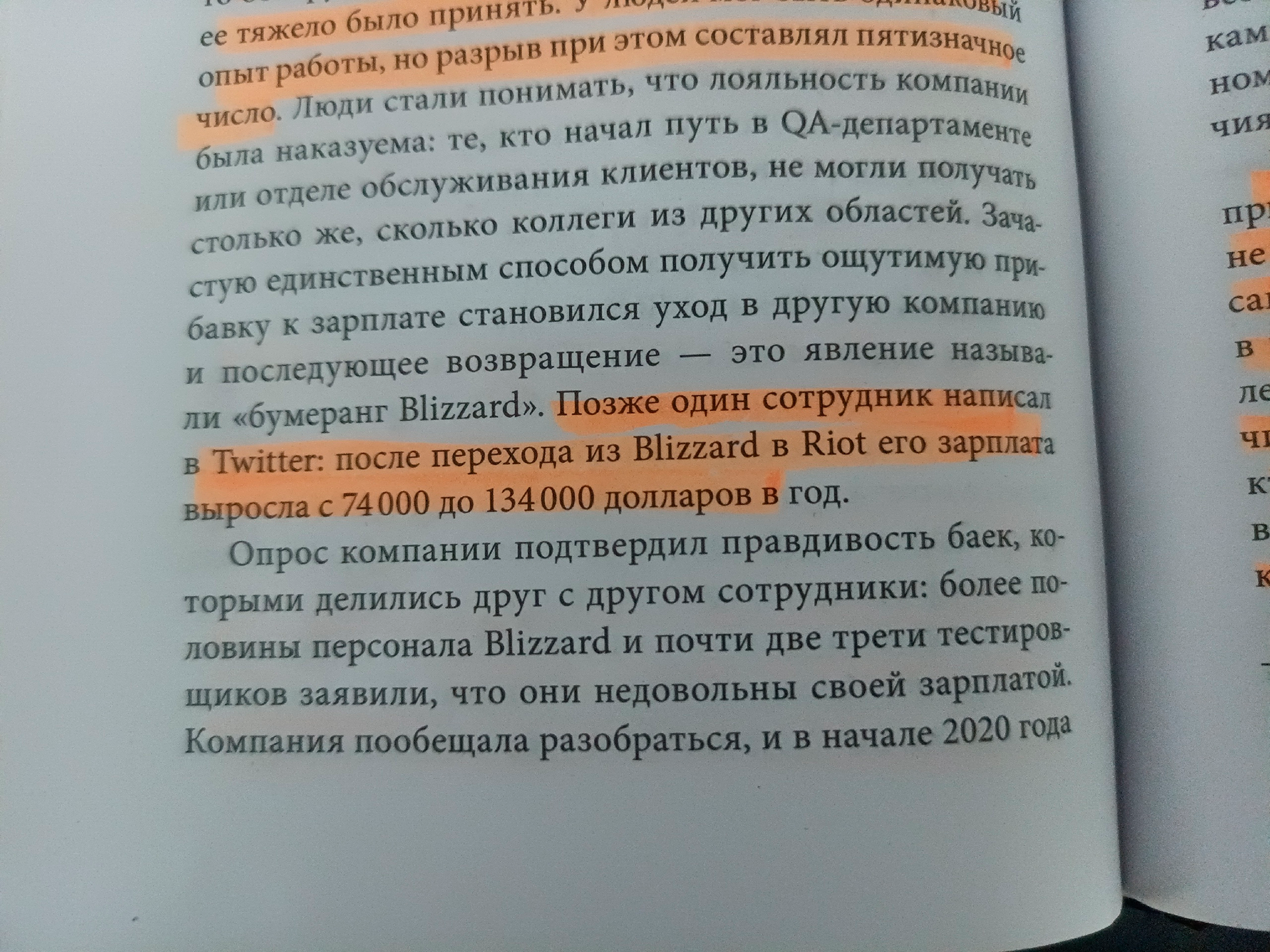 Разработчики сверхприбыльных World of Warcraft и Hearthstone получали хорошие бонусы. В удачный год могли на них машину купить или погасить ипотеку, но после выхода Overwatch и прихода Зерзы бонусы разочаровывали, а зарплаты оставались относительно низкими. Один разработчик поделился в твиттере: его зарплата с 74 тысяч увеличилась почти вдвое — до 134 после ухода из Blizzard в Riot.