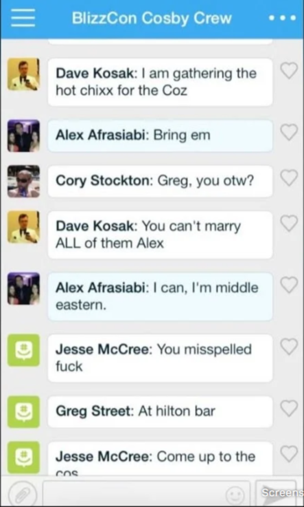Котаку раскопали фото, где сотрудники фотографировались с фото Косби до того, как история про насилие стала известна общественности. Также вставили цитату про телочек Косака без контекста. Котаку рассказали так, будто в Blizzard начальники занимаются насилием в отношении молодых сотрудниц.