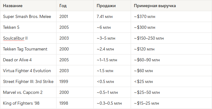 Однако, несмотря на всеобщее признание критиков и игроков, общая выручка жанра за этот период неуклонно падала. И хотя эти проекты ни в коем случае нельзя назвать коммерческими провалами, ни один из них даже близко не подобрался к 15 миллионам проданных копий и 1,5 миллиардам долларов выручки Street Fighter 2. Тот же Tekken 5, будучи гораздо успешнее четвертой части, все равно отставал от продаж Tekken 3. В то же время игровая индустрия в целом переживала взрывной рост. Один только World of Warcraft приносил от 1 до 1,5 миллиардов долларов в год, что превышало доходы всего жанра файтингов в два-три раза.