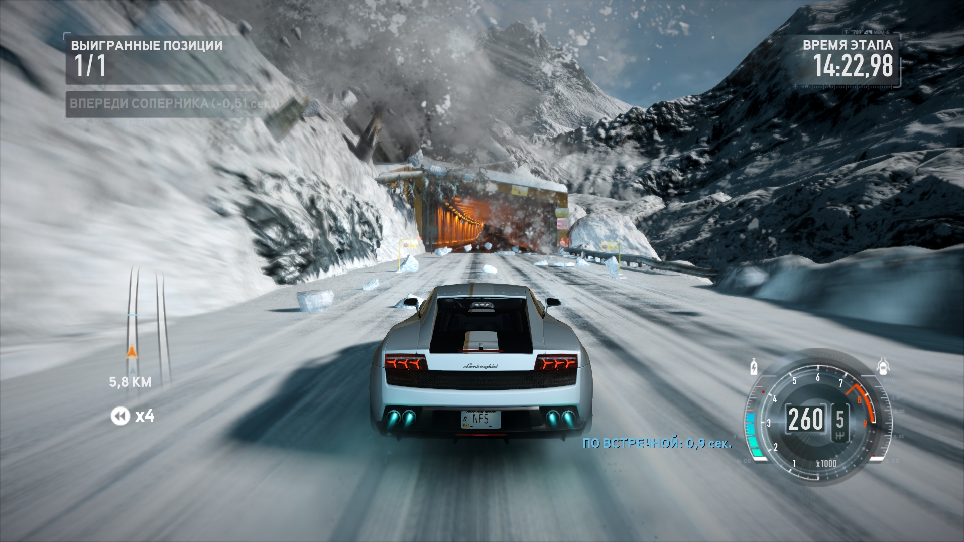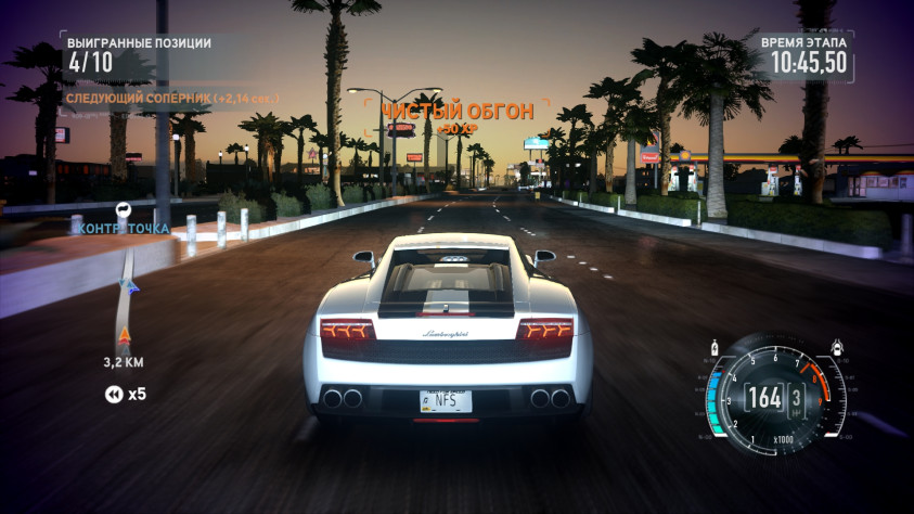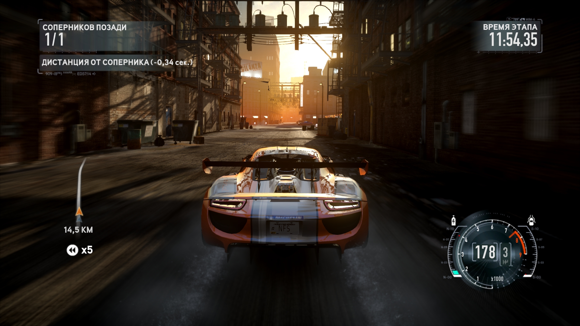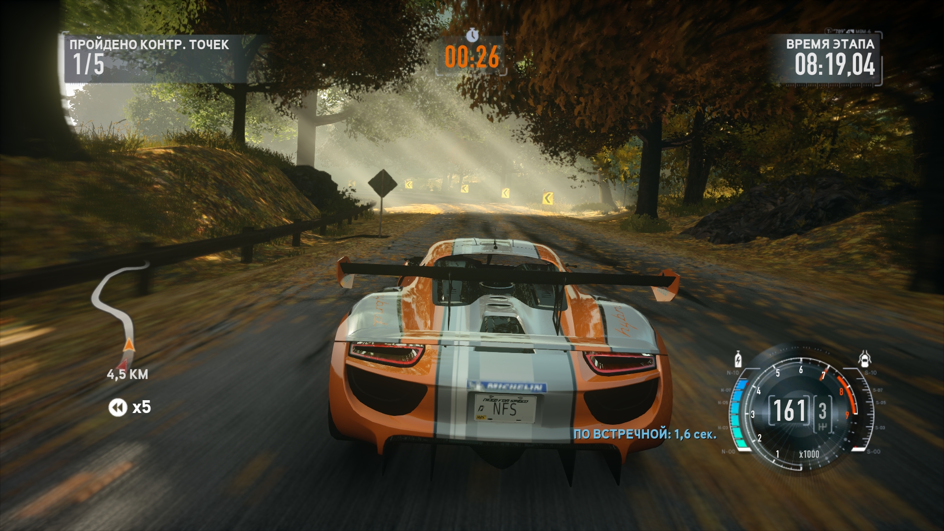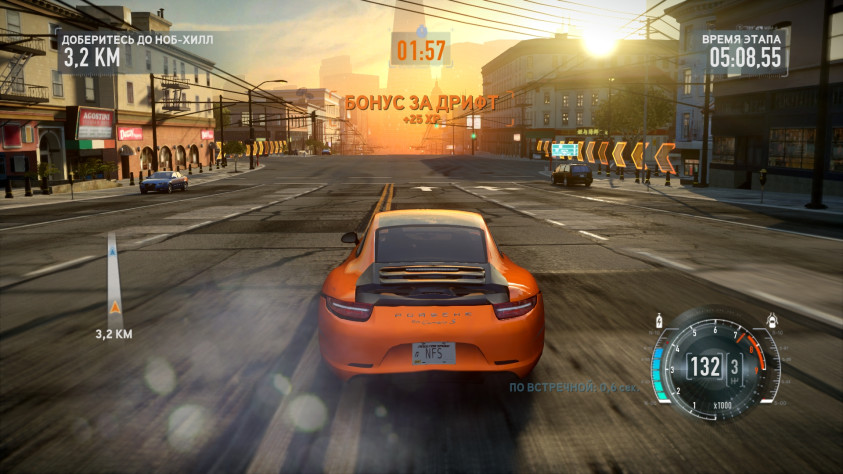 С одной стороны это единый большой заезд, где надо просто обгонять других участников, с другой стороны, есть разделение на отдельные гонки, которые могут быть трёх видов: спринт, контрольная точка и битва. Первое понятно, просто едем от точки к точке среди 10 гонщиков и пытаемся к финишу доехать первым. Контрольная точка предполагает гонку со временем, когда по трассе расставили точки, которые нужно достичь за какое-то время. В «Битве» у нас будут один, два или три сильных соперника, которых надо попытаться опередить. Отдельного режима ухода от полиции с разрушениями тут нет, полиция будет доставать вас во всех режимах.