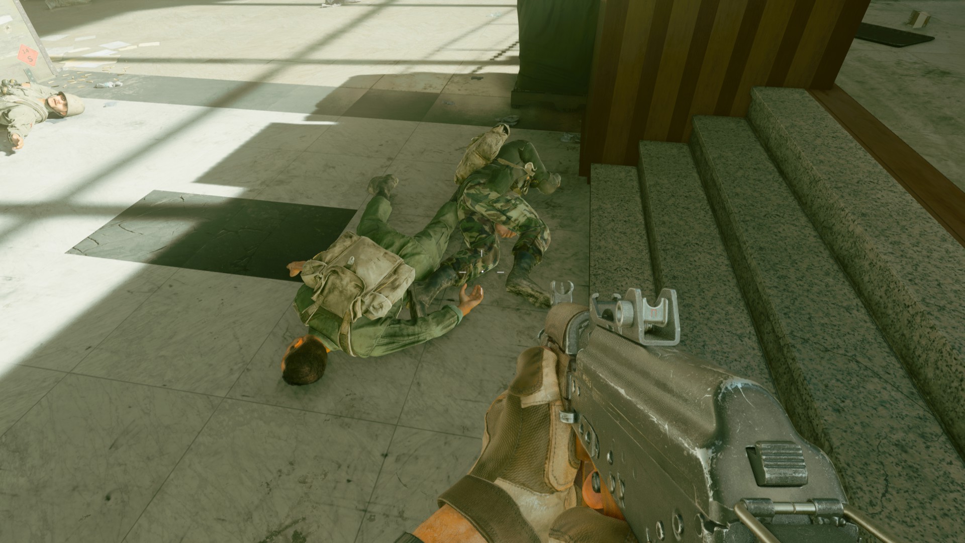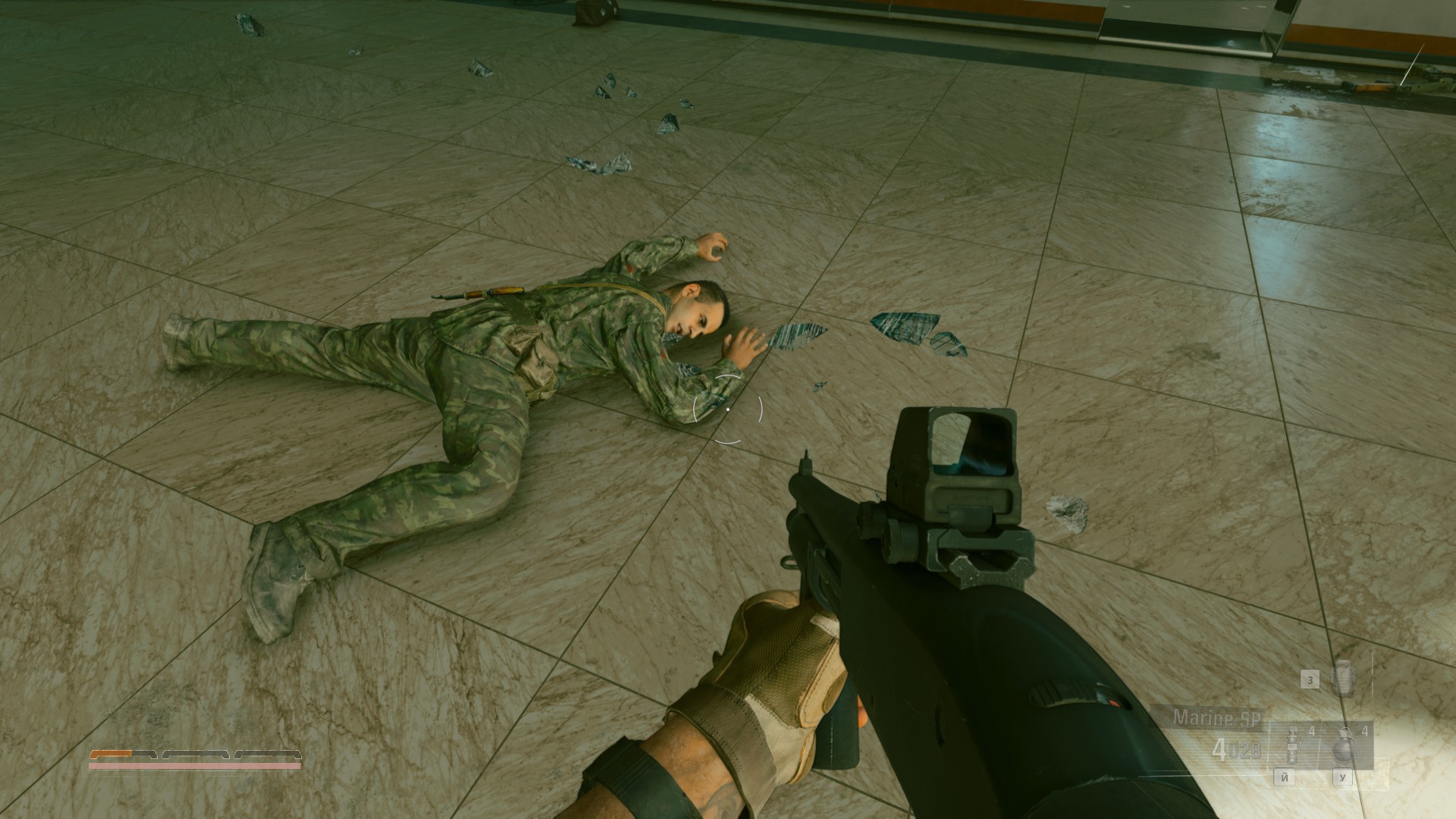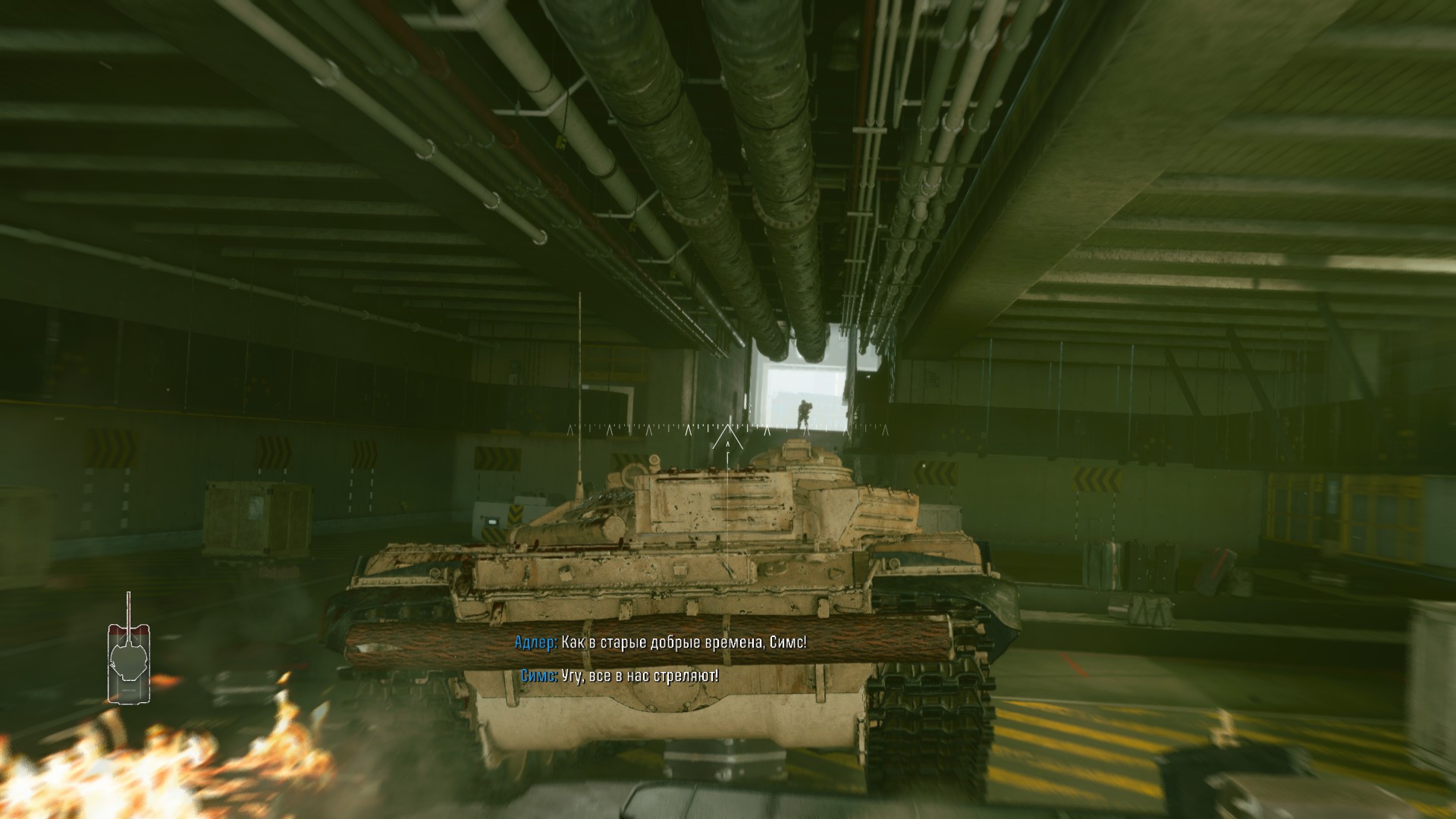 В конце уровня, продвигаясь через аэропорт, столкнёмся с большим количеством противников и техники, в том числе танков Т-72. На одном из них нам будет необходимо прорваться, чтобы захватить учёного.