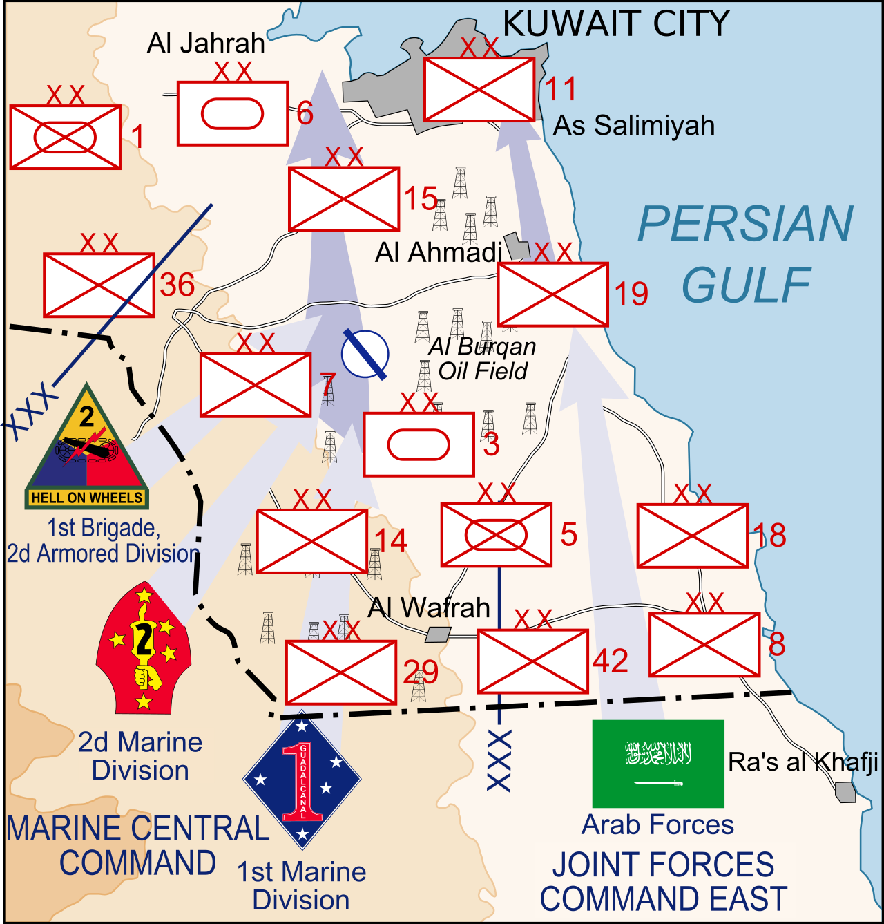 Ирак понёс тяжелые потери. Было взято в плен более тысячи военнослужащих, а сотни иракских танков и бронетранспортеров были уничтожены или захвачены. Для сравнения: потери армии США исчисляются 19 убитыми, 48 ранеными, 1 поврежденным танком M1A1 и 10 уничтоженными/поврежденными танками M60A1. На третий и последний день боевых действий 2-я дивизия морской пехоты США освободила город Аль-Джахра, а затем заняла господствующие высоты на хребте Мутла, перекрыв иракский путь отступления из Кувейта в Басру. Танки M1A1 уничтожили большую часть из 166 иракских танков, которые дивизия заявила в тот день.