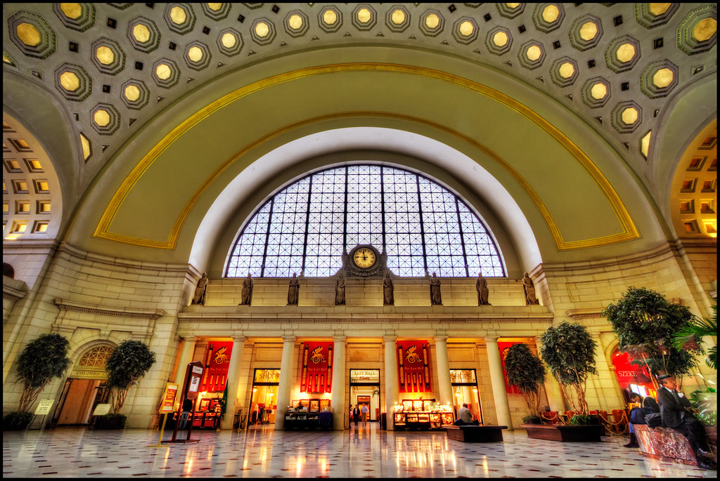 Вокзал Union Station расположен в Вашингтоне и является вторым по значимости в США после вокзала Penn Station в Нью-Йорке. Здание вокзала было построено по проекту архитектора Дэниеля Бернхама в начале XX века. Длина здания составила 182 метра, что сделало его на тот момент самой большой железнодорожной станцией в мире. При строительстве использовались качественные и дорогие материалы — мрамор и гранит. Центральная арка вокзала высотой 29 метров украшена золотыми листьями. Бюджет составил огромную сумму в 125 миллионов долларов.