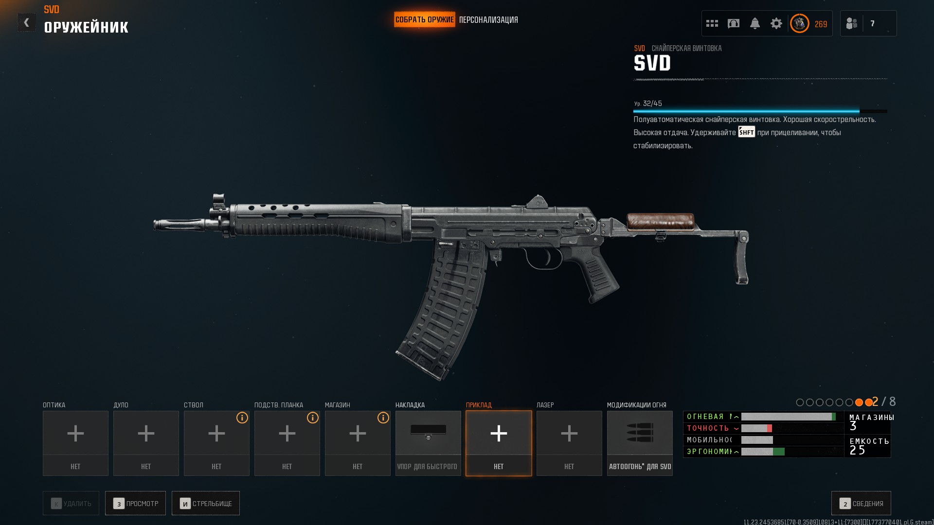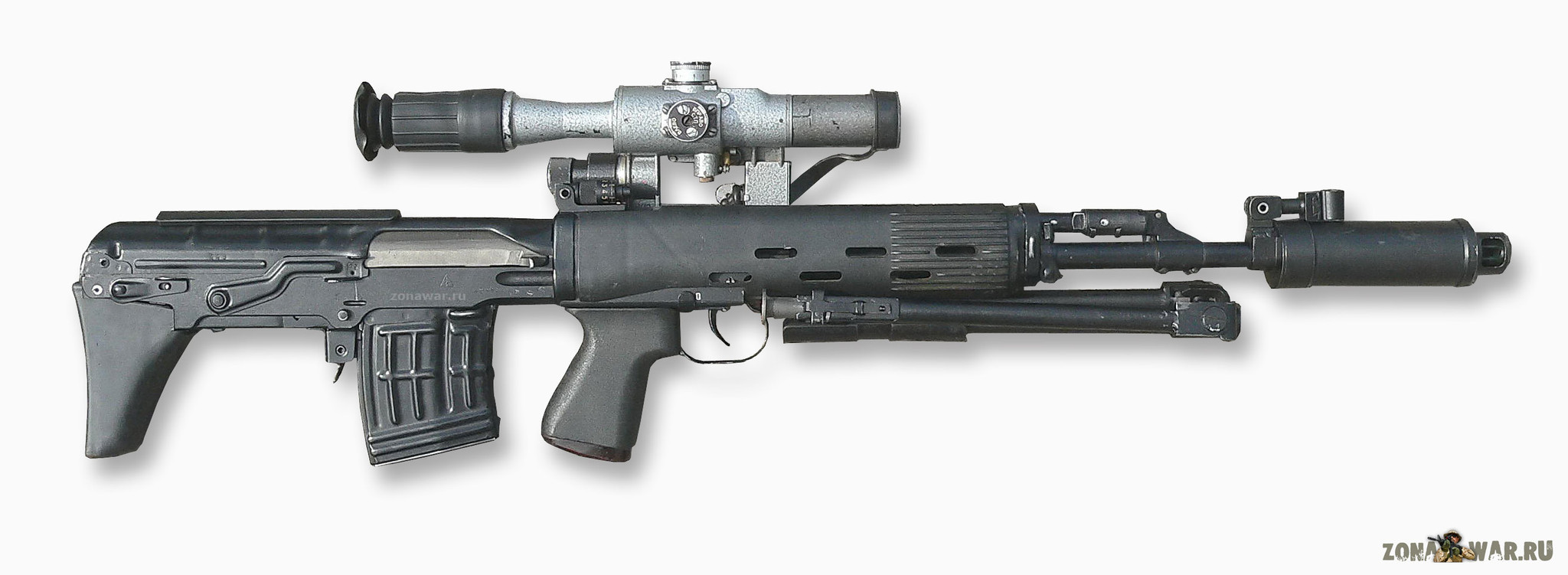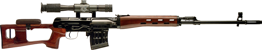 СВД с оптическим прицелом ПСО-1 доступна под собственным названием. Следует отметить, что персонаж игрока включает предохранитель в начале анимации осмотра оружия и выключает его в конце; это не делается при осмотре пустой винтовки, так как затвор мешает. Насадка «Накладка для быстрого прицеливания» — это стандартная щека приклада СВД, а «ДТК» основан на дульном устройстве эстетически похожей румынско снайперской винтовки PSL.