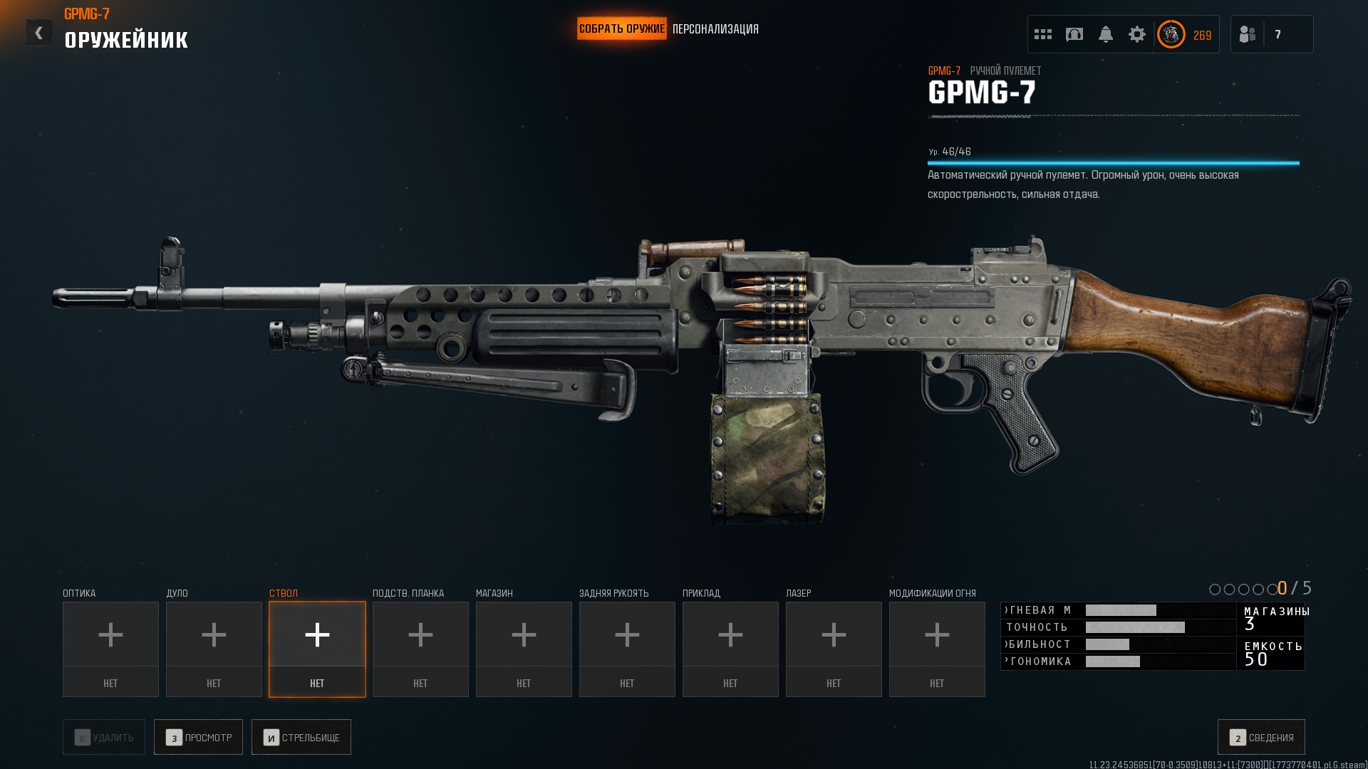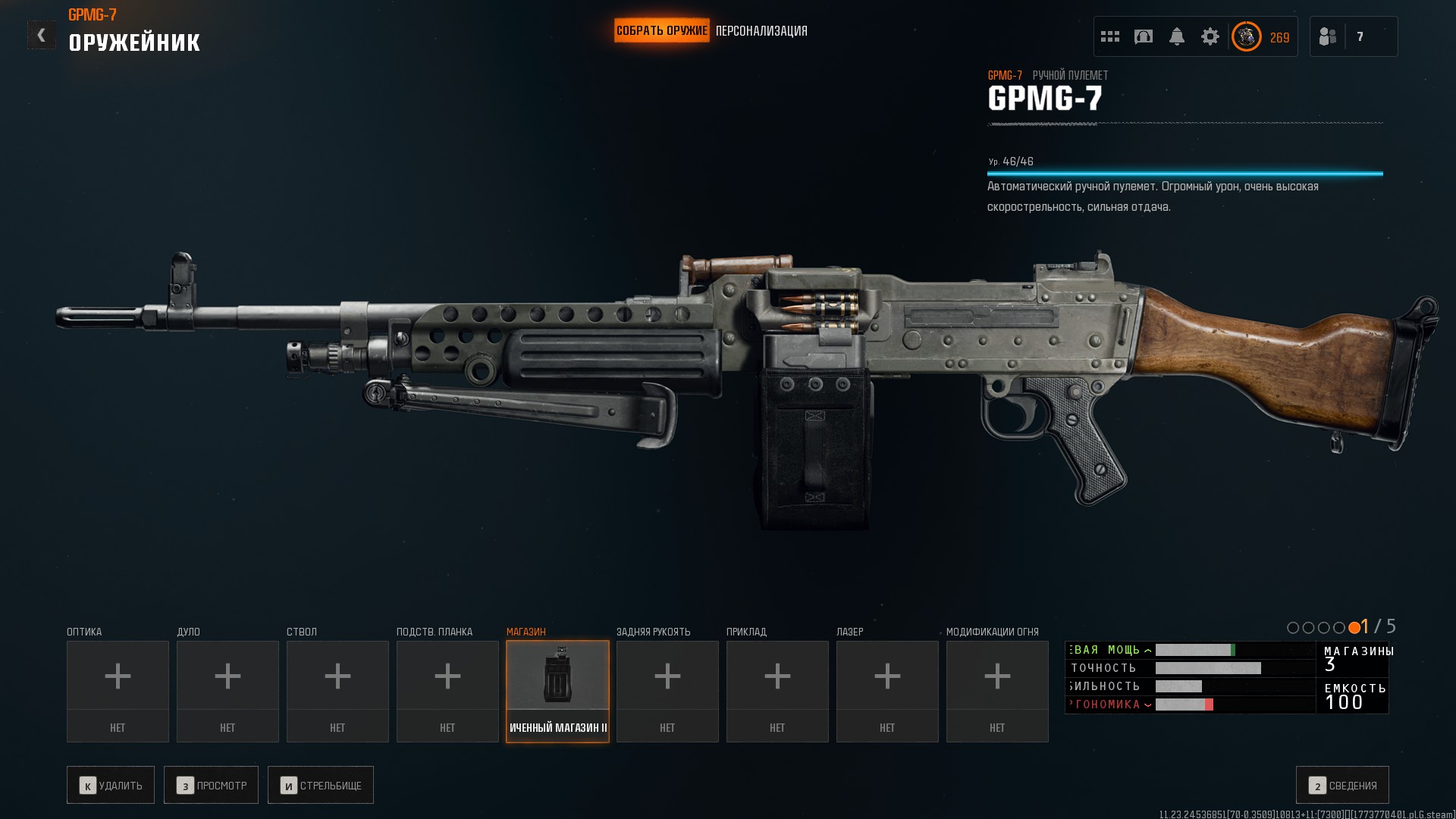 FN MAG 58 с элементами шведского пулемёта Ksp m/58 представлен как GPMG-7, что является отсылкой к британскому варианту L7 GPMG. Внутриигровая модель имеет большинство деталей MAG 58, в частности, спусковую скобу, рукоятку затвора, газовый регулятор и мушку. От Ksp 58B у него есть газовый блок, приклад, а также верхняя планка для оптики от Ksp m/58F. Отрадно, что в отличие от многих, многих, многих изображений этого семейства оружия в видеоиграх, окно выброса гильз не закрыто ящиком с патронами, а все варианты лент оставляют зазор под окном выброса гильз.