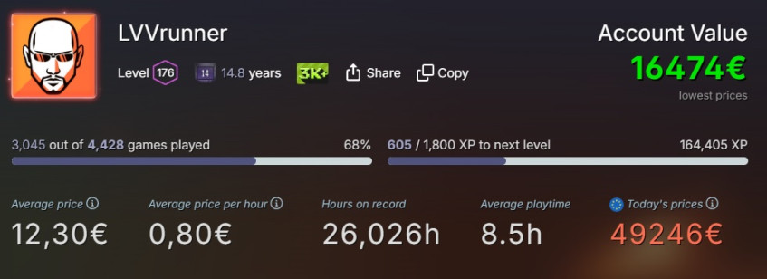 Чтож. Пора мчать зарабатывать денежки для покупки игр. Напоследок приведу свою личную стату в Steam. Не так давно научился её смотреть. Вроде не обеднел и почти во всё сыгранул хоть сколько. Кайф.