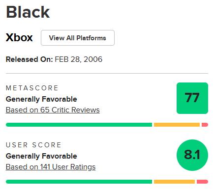 Black вышла 24 февраля 2006 года на PlayStation 2 и оригинальном Xbox. На релизе игра получила тёплый приём — её хвалили и критики, и игроки, особенно отмечая технологичность и зрелищность для своего времени.