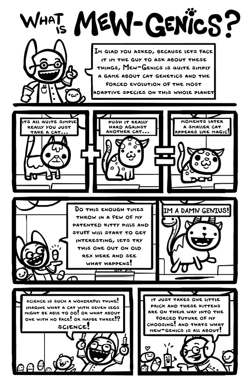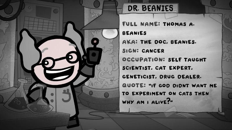 Изобретения Доктора Бинса крайне оригинальные, как вам например такая вещь, как картонка со злым смайликом, которая сводит вашего кота с ума и заставляет его драться против вас? Или как вам специальная паучья инъекция, которая мгновенно заполняет мозги ваших котов паучьими яйцами? Подобный изобретений у Бинса огромное множество, и за каждые 5 котов он готов дать вам одно из на тестирование.