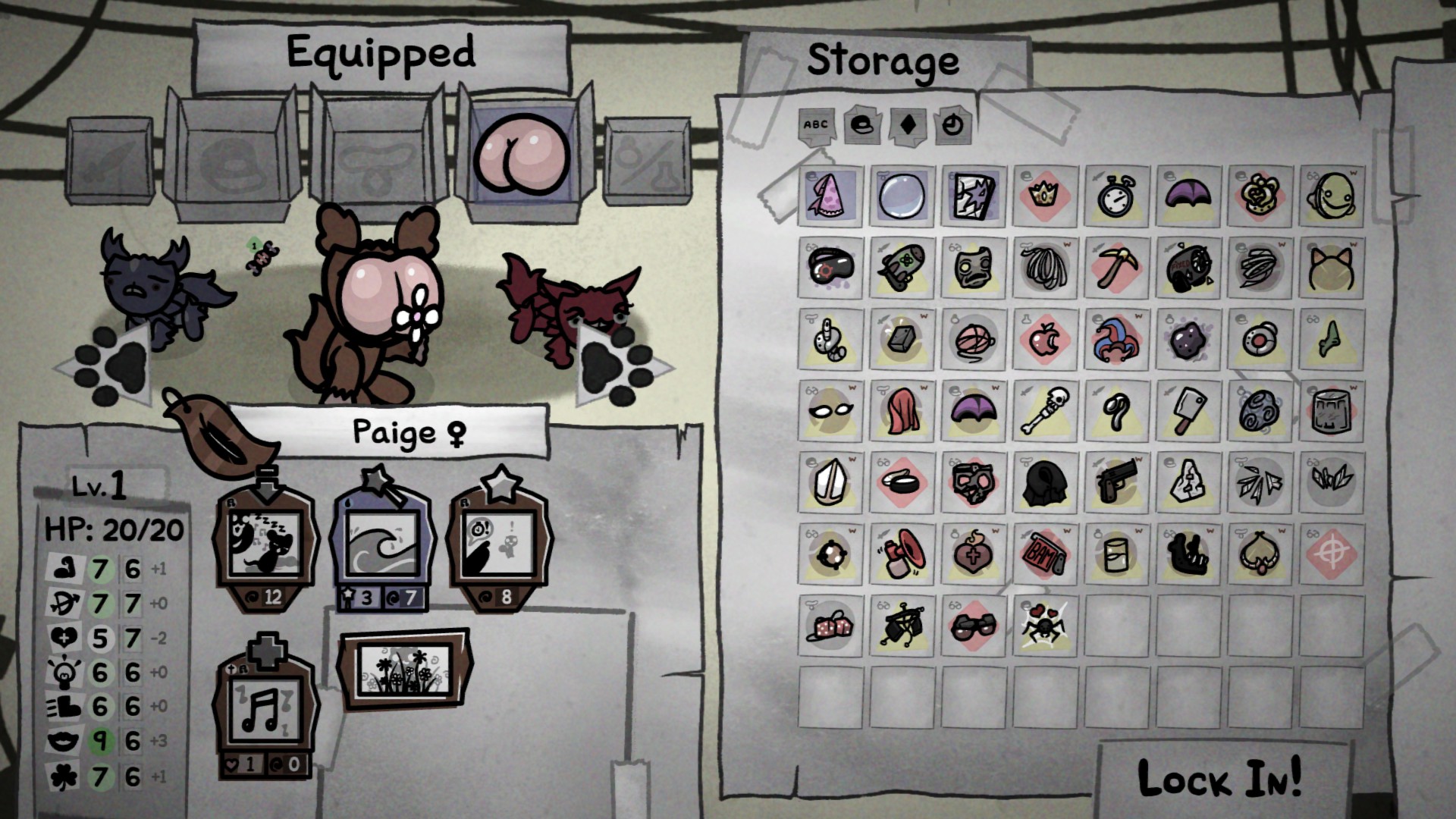 Но есть одно важное отличие от Айзека. В отличие от первого рогалика Макмиленна, где у игрока во время забега была возможность получить практически все вещи в игре (технически нет, но 50% уникальных вещей игра давала возможность собрать), в Mewgenics у игрока такой возможности просто нет. Как бы вы не ухишрялись, и не надрывались, конкретный кот закончит забег с 4 активными и 2 пассивными навыками, 1 тот и другой у вас будет возможность улучшить, но на этом всё. После того как вы прокачали эти навыки. Всё, ваш кот, как бы он не хотел, не сможет стать принципиально сильнее, а значит и фактор того соберётся имба или нет - в частности зависит от удачи. Если при прокачке вам не предложат тот скилл который нужен, то вы просто не сможете сломать игру.