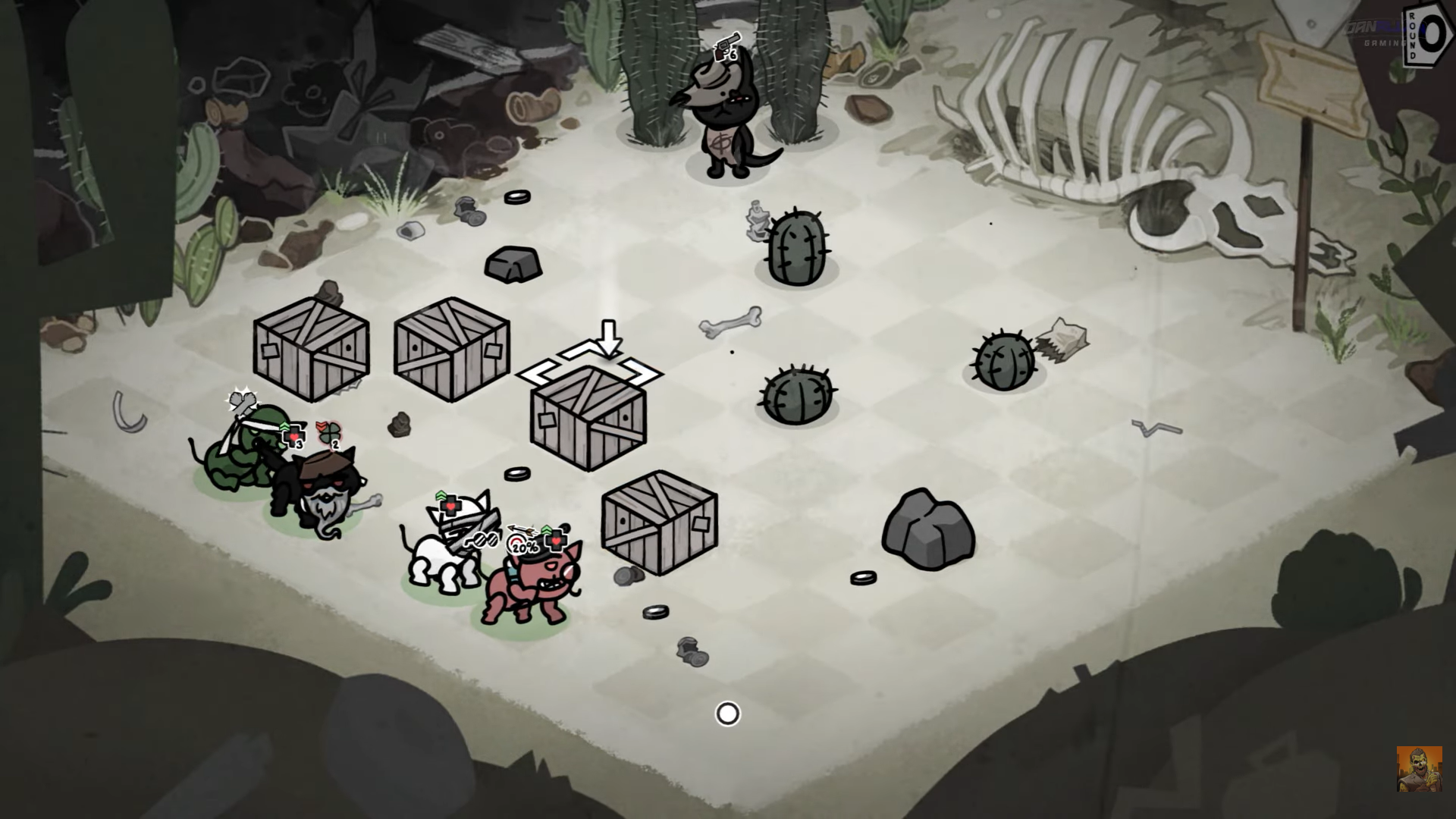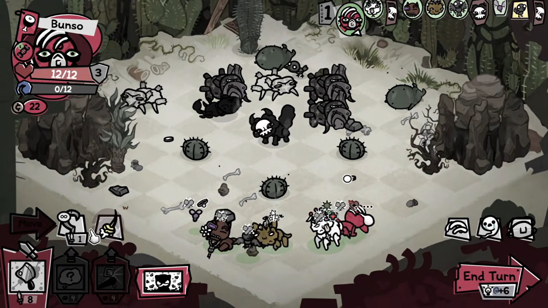 Врагов без фишек в игре просто, каждый враг - уникальный гаврик у которого какая-то да и фишка имеется. Во второй локации например есть акулы, которые получают дополнительных ход за каждого юнита с кровотечением, в пустыне есть стаи мух, которые имеют всего 5 хп, но получают всего по 1 урона из любого источника, а в одной из последних локаций будут встречаться враги, которые отражают от себя все возможные снаряды, и которых нужно убивать именно мили боем. Каждый бой при этом - заранее продуманная сцена, никаких случайных генераций, всё продуманно и сделано заранее. К сожалению у меня не выходит найти эту генерацию, но на одном из боссов вас могут заспавнить окружённым мусором, вам придётся его разгребать что-бы получить какое-то пространство для манёвров.