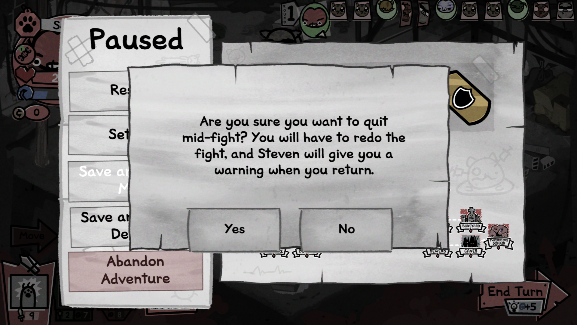 По умолчанию игра не предоставляет никаких возможностей для рестарта хода или всего боя. Вы можете пройти игру на 100% и так и не узнать о существовании этой механики. Однако если вы человек эмоциональный и в случае потери любимого кота не побрезгуете нажать Alt+f4, то при следующем запуске вы заметите интересную деталь.