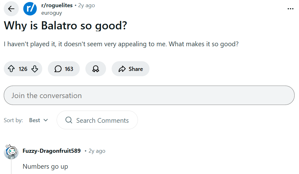 Сейчас, это уже не такая редкая практика, далеко за примерами ходить не нужно. 2 года назад одним из кандидатов на игру года был инди рогалик Balatro. В котором геймплейная идея настолько простая, что вам будет достаточно 2 минут на то, чтобы полностью понять все игровые механики и как в это нужно играть. Но при это насколько игра была увлекательной, настолько что добралась до самых высоких наград для игр возможных.