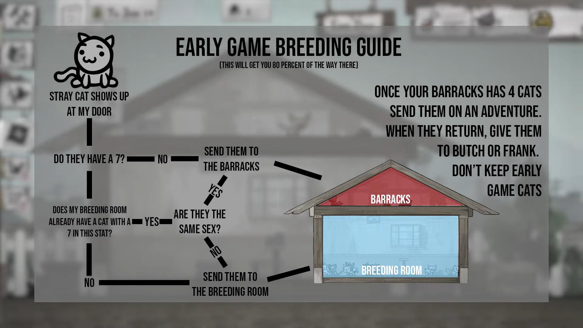 К счастью могу вас обнадёжить, это не так, можно пустить вывод котов на самотёк, фишки с наследуемыми абилками/статами и болезнями тут работают, и тут есть где запариться, в игре есть очень много всяких вещей направленные на упрощение этого процесса, но если у вас в планах нет цели вывести идеального кота, эстетически или по силе, то на всё это спокойно закрываются глаза. Можете просто сбагривать всех котов в одну комнату где они будут сидеть и заниматься своими кошачьими делами. Никаких особых проблем при таком подходе вы испытывать не будете.