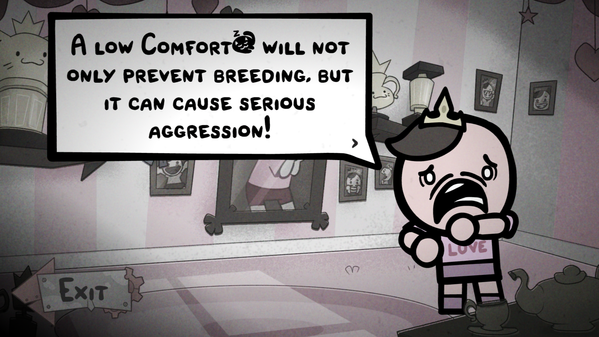 Вы должны следить за вашими котами, ведь если условия их обитания неподходящие, то они не будут делать котят, а без котят вы будете не в состоянии даже забеги играть. При этом коты делают котят с кем попало, даже со своими самыми близкими родственниками, поэтому в идеале ещё нужно следить за тем, чтобы возможные проблемные индивиды находились в разных помещениях дома. Это не говоря уже о том, что вы вроде как по игре должны выводить новых котов, это буквально подразумевается в названии игры.