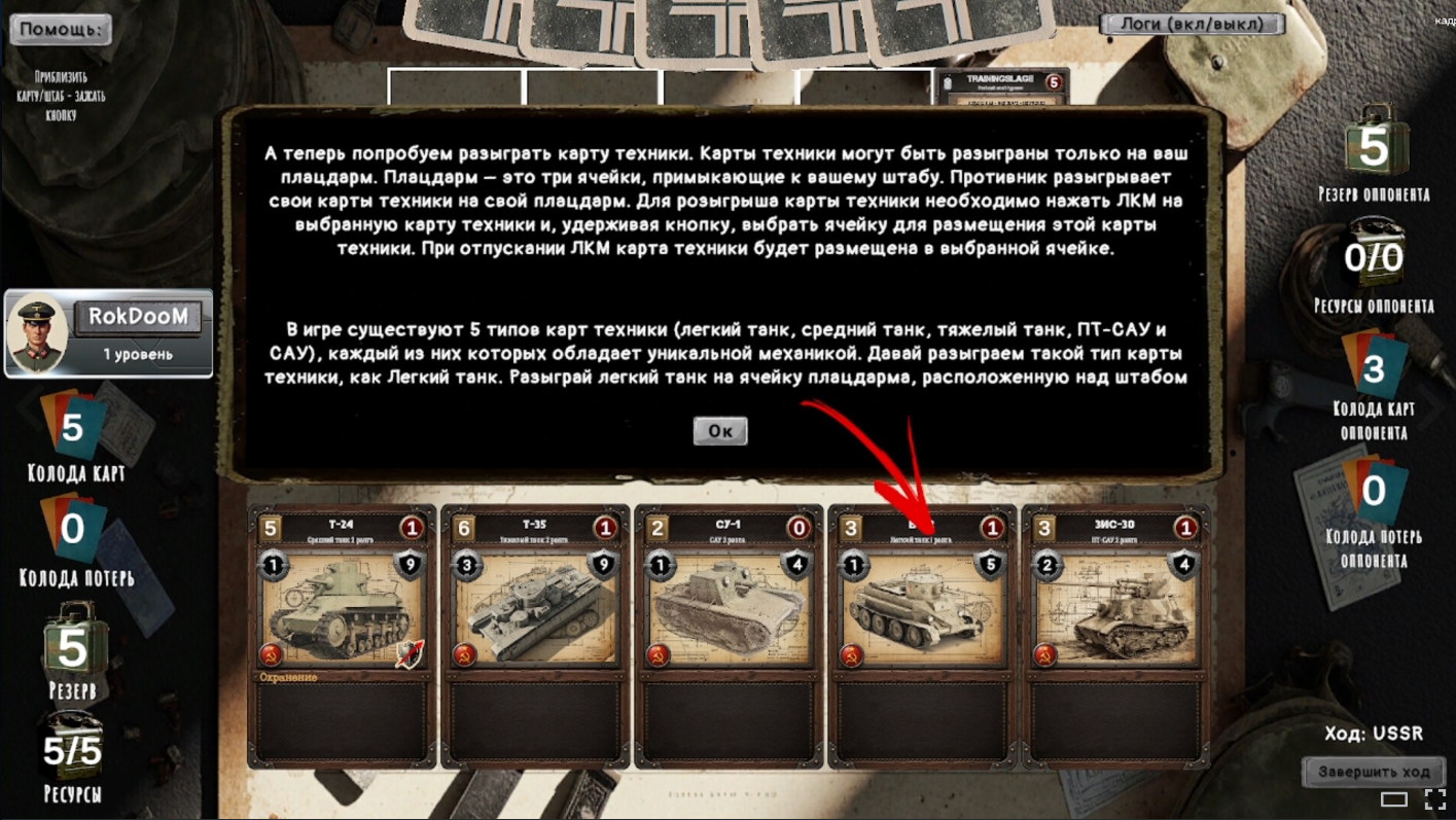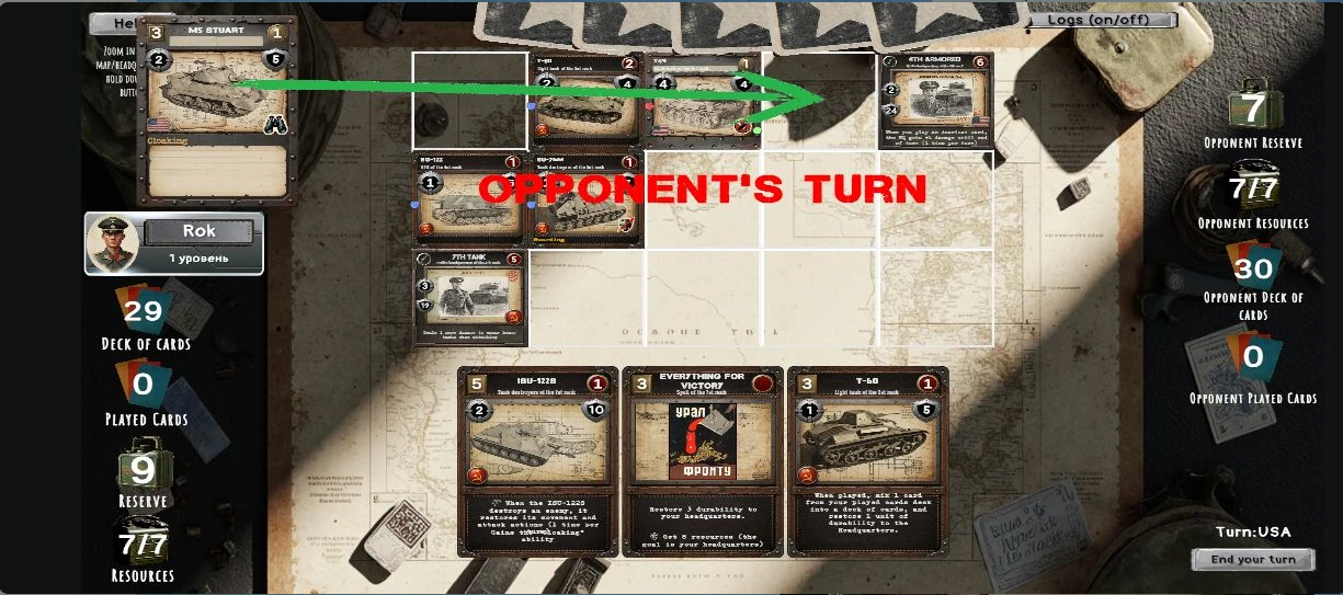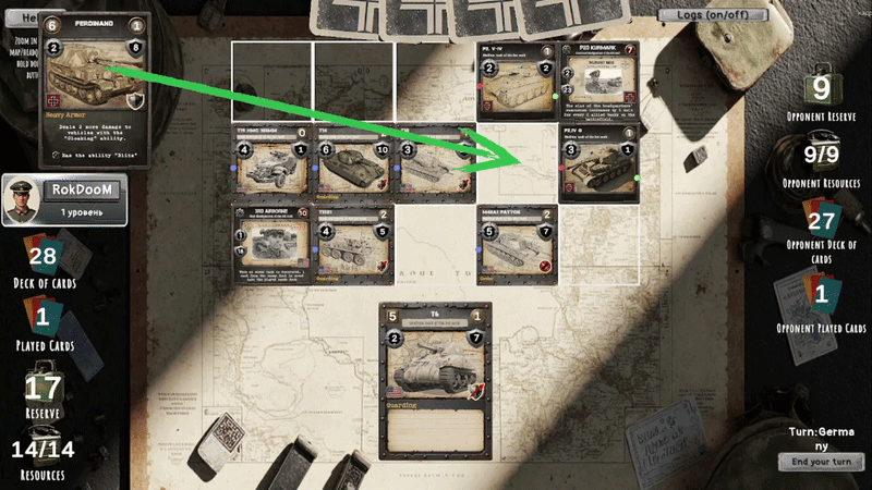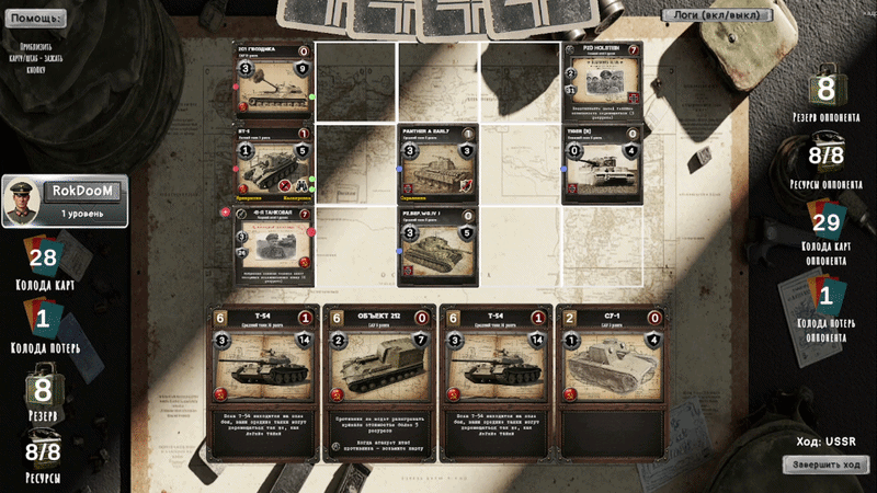 Эта игра, на мой взгляд, обладала просто гениальными решениями, когда каждый тип карты техники (легкий танк, средний танк, тяжелый танк, САУ и ПТ-САУ) обладали своими уникальными особенностями, характерными именно для этого типа техники. Например, легкий танк мог совершить 2 действия передвижения за ход, что позволяло ему «засветить» противника для своих САУ (подъехать к врагу, САУ отработала, и отъехать). И т. д. Как мне кажется, это было просто великолепное смешение таких жанров, как танковые и карточные игры. Вот демонстрация, чтоб было понятно о чем идёт речь: