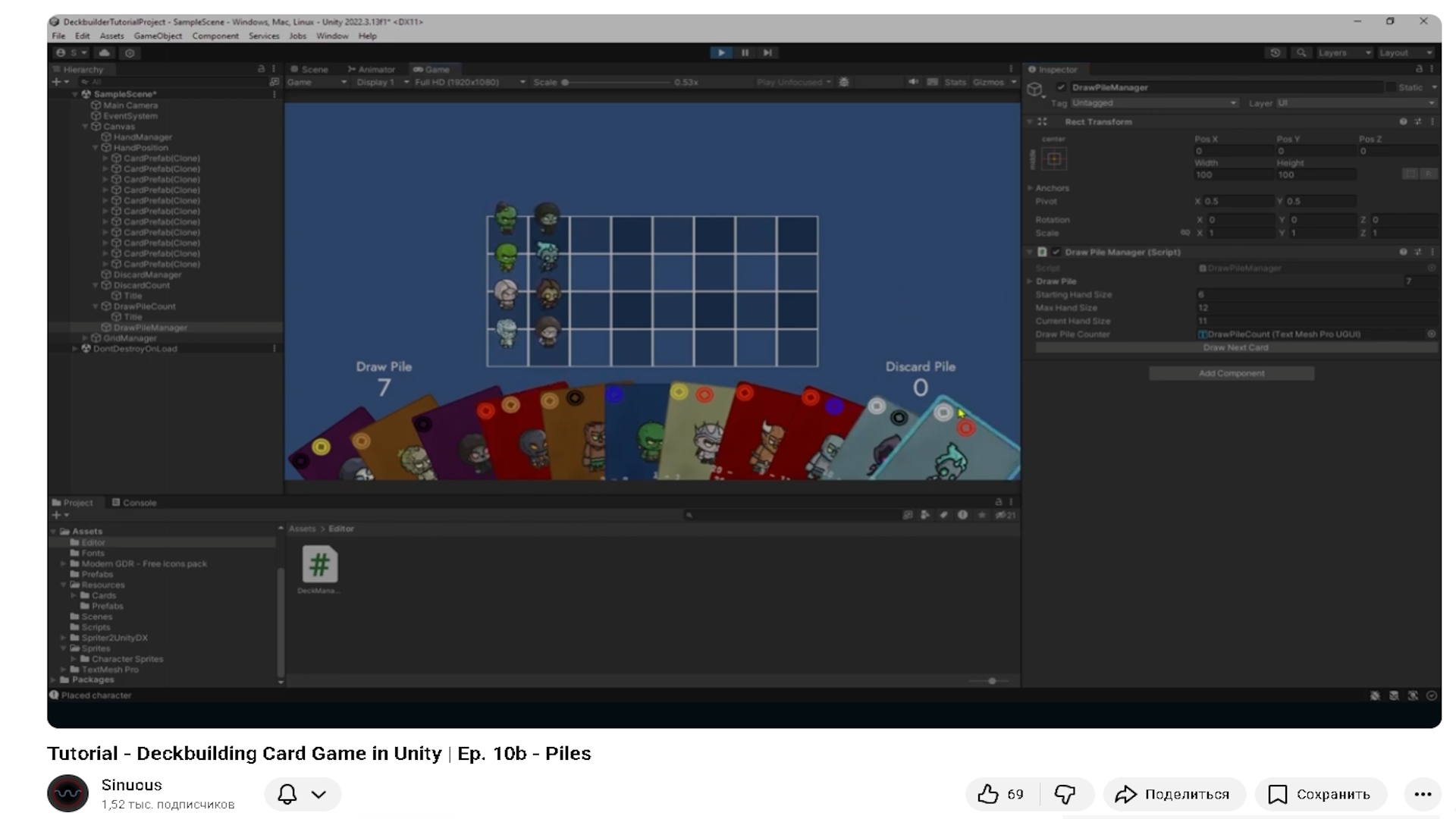 Пазл 1-й: удачная находка. Изучая ютуб в поисках ответа на вопрос «С чего начать?» я напоролся на очень маленький канал зарубежного автора (Sinuous), у которого на тот момент было всего 500 подписчиков, но который выпустил цикл из 10 видео, где шаг за шагом идёт создание карточной игры. Причём не просто карточной игры, а карточной игры, которая имеет такую необходимую для меня механику, как сетка игрового поля, куда могут размещаться карты с руки. Не говоря уже о том, что в видео показывается создание с нуля таких базовых
