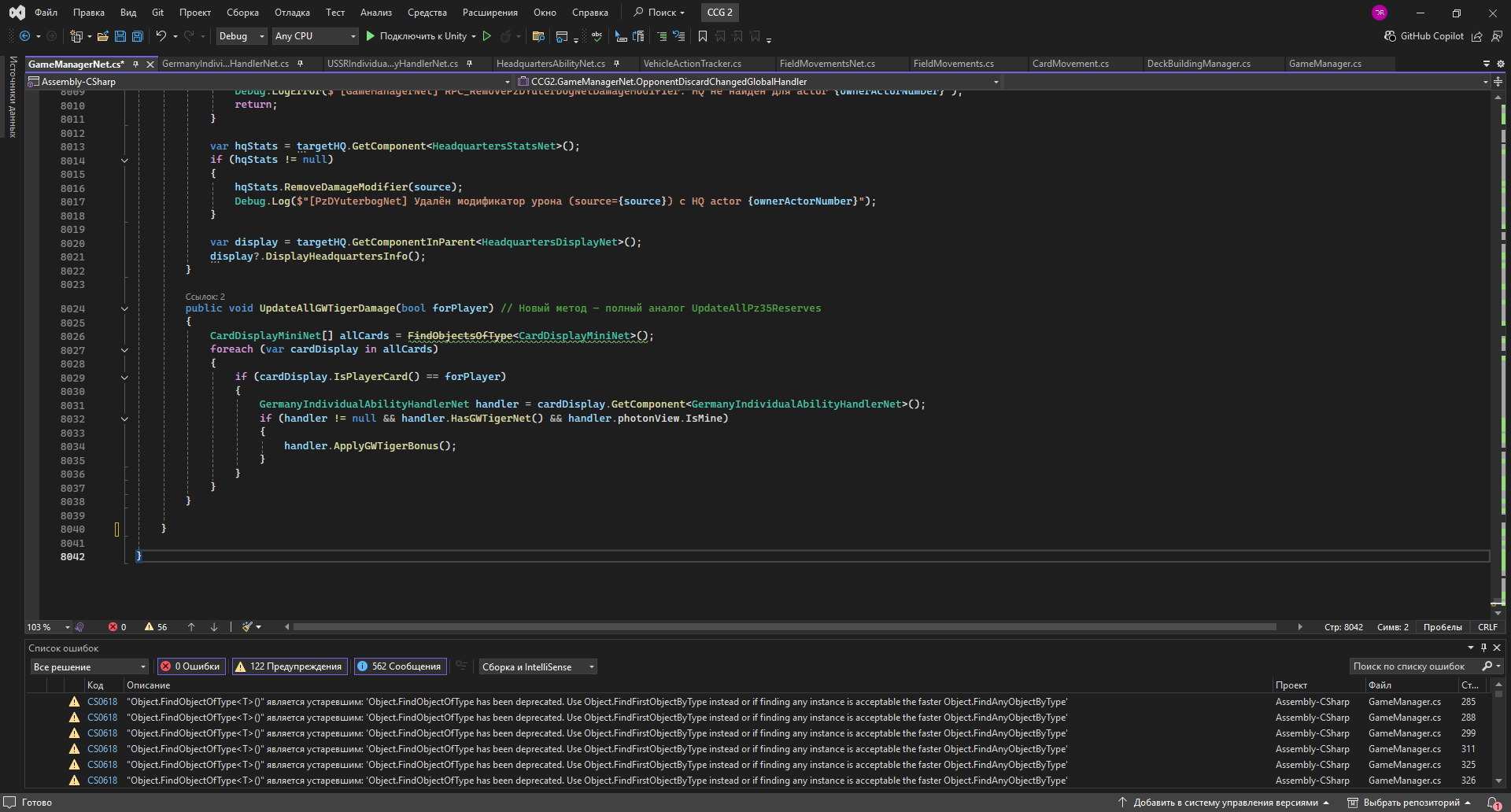 Так вот, в конце мая 2025 года я принялся за создания сетевого режима. По совету Grok реализацию сетевого режима я начал с помощью сервиса Unity, т.к. он интегрирован в сам движок Unity editor. Результат оказался закономерен – у меня ничего не вышло. От слова – вообще. Моего скудного опыта хватило только на реализацию сцены создания сетевой игры, а переход на игровую сцену вызывал около 1000 ошибок, которые я более двух недель пытался устранить. И устранял до тех пор, пока не понял, что я творю глупость и ничего хорошего из этого не выйдет. Вот так примерно это выглядело: