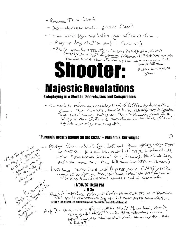 Через год родился дизайн-документ на 500 страниц. Проект назывался пока «Shooter: Majestic Revelation» - ирония для игры, которая хотела сломать все каноны шутеров.