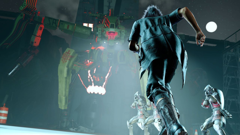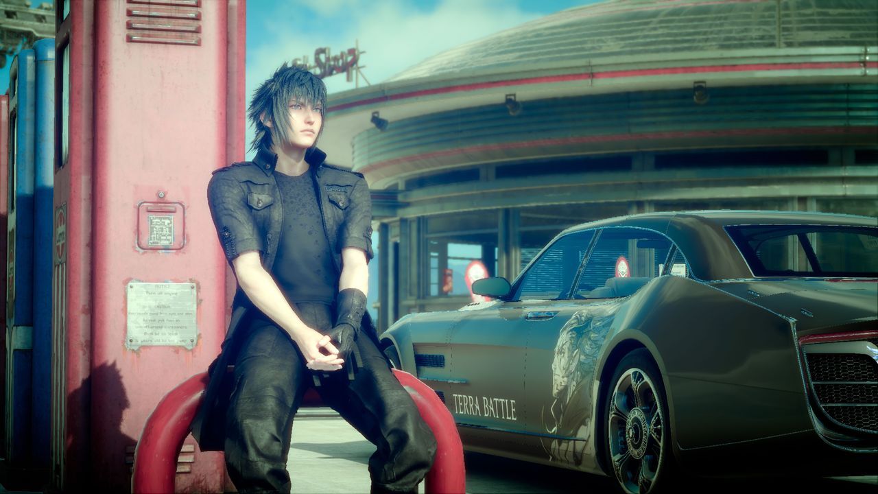 И для этого возвращения придумали очень необычный сеттинг, совмещающий относительно современные пейзажи одновременно с фэнтези и фантастикой про высокие технологии. То есть представьте достаточно сухие и пустынные виды по типу самых южных штатов США: эти бесконечные уходящие за горизонт асфальтированные шоссе, раскалённые дневным солнцем… и вы едете по ним с друзьями на своей крутой тачке, заезжаете на автозаправку, знакомитесь там с привлекательной работницей (японская же игра)… только вокруг ещё бегают какие-нибудь чокобо, бродят вот эти по-японски задизайненные монстр (некоторые даже бывают исполинскими боссами, загораживающими целый экран)… но также где-нибудь поблизости может быть хайтек-военная база с прямоходящими боевыми роботами. Вот.