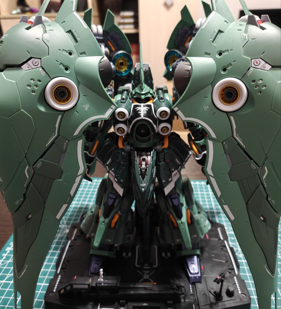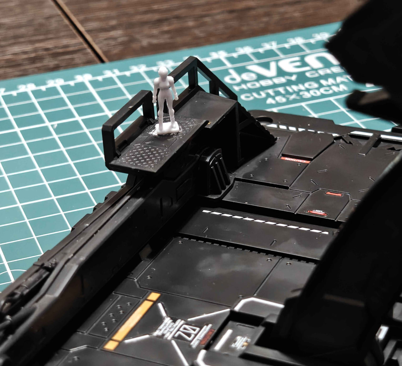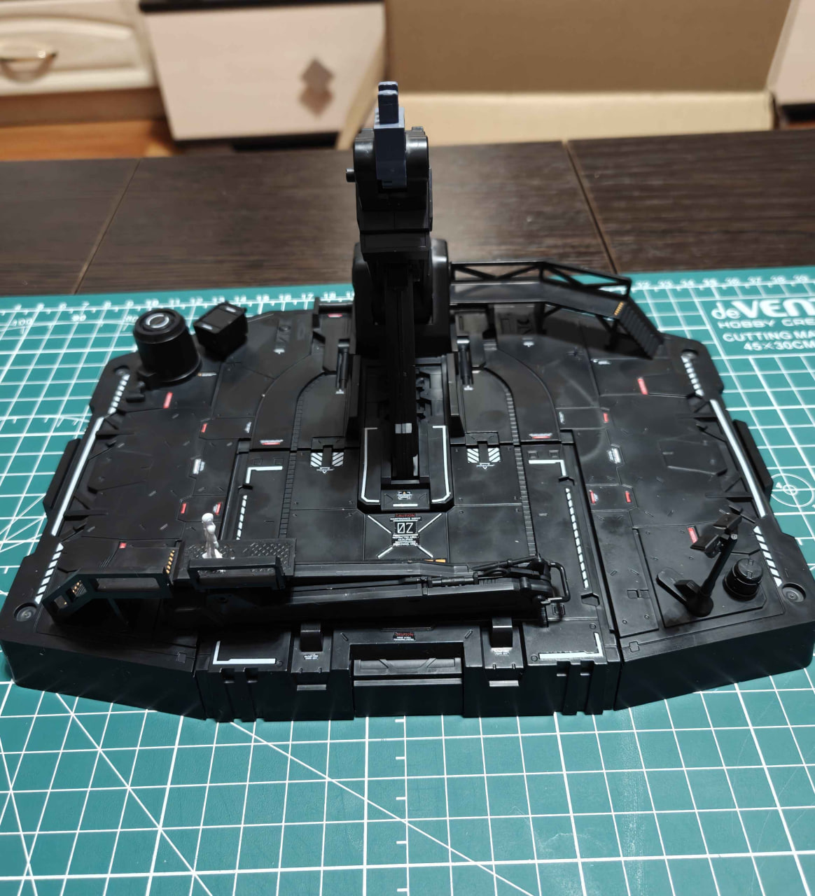 Еще из прикольных гимиков: т.к это модель от другой фирмы, то у Осириса подставка представляет собой буквально станцию по обслуживанию Меха, со всякими поднимающимися платформами(которые не поднимаются), прожекторами, тележками и т.д. Даже 1 человеческая дополнительная модель есть. И в самой подставке есть выдвижной ящичек для аксессуаров