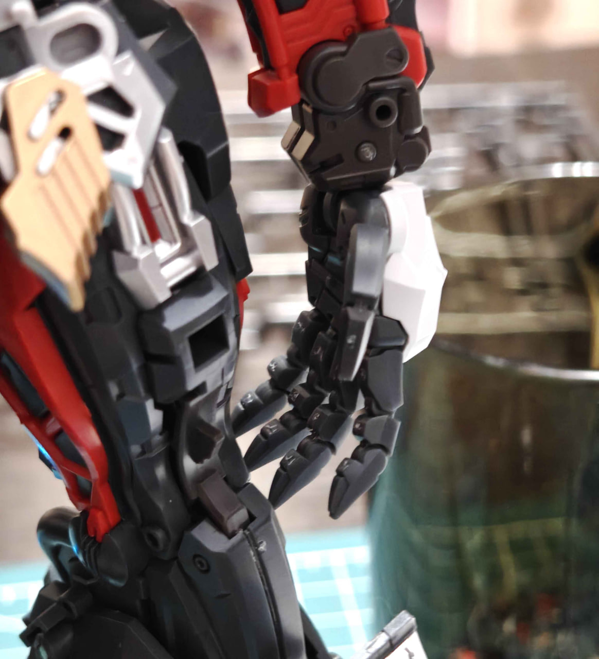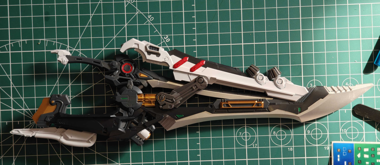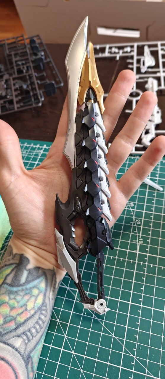 Кроме размеров и фантастического дизайна(который я ставлю на 1 уровень с Немезисом), Фенрир, как таковой, выделяется только своим оружием, где один меч вставляется в другой, образуя огромный меч, а еще своими руками. Это тоже модель с подвижными пальцами, как Лизрд. но в отличии от Лизарда, где пальцы состояли из 2х отдельных деталей, пальцы Фенрира - это одна цельная деталь. Да, все верно - это одна цельная деталь, которая гнется в двух суставах! Я такое никогда не видел до этого, даже среди моделей от Bandai! Я в целом не представлял что такое возможно создать методом отливки, которым создаются литники с деталями для модель-китов.