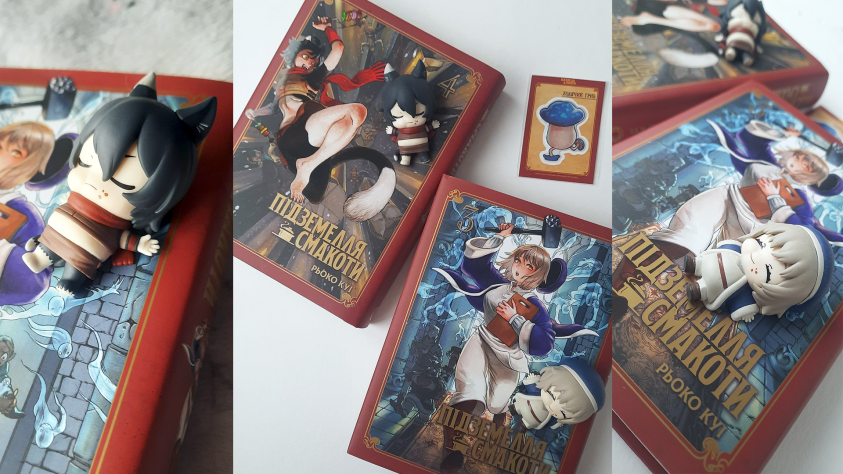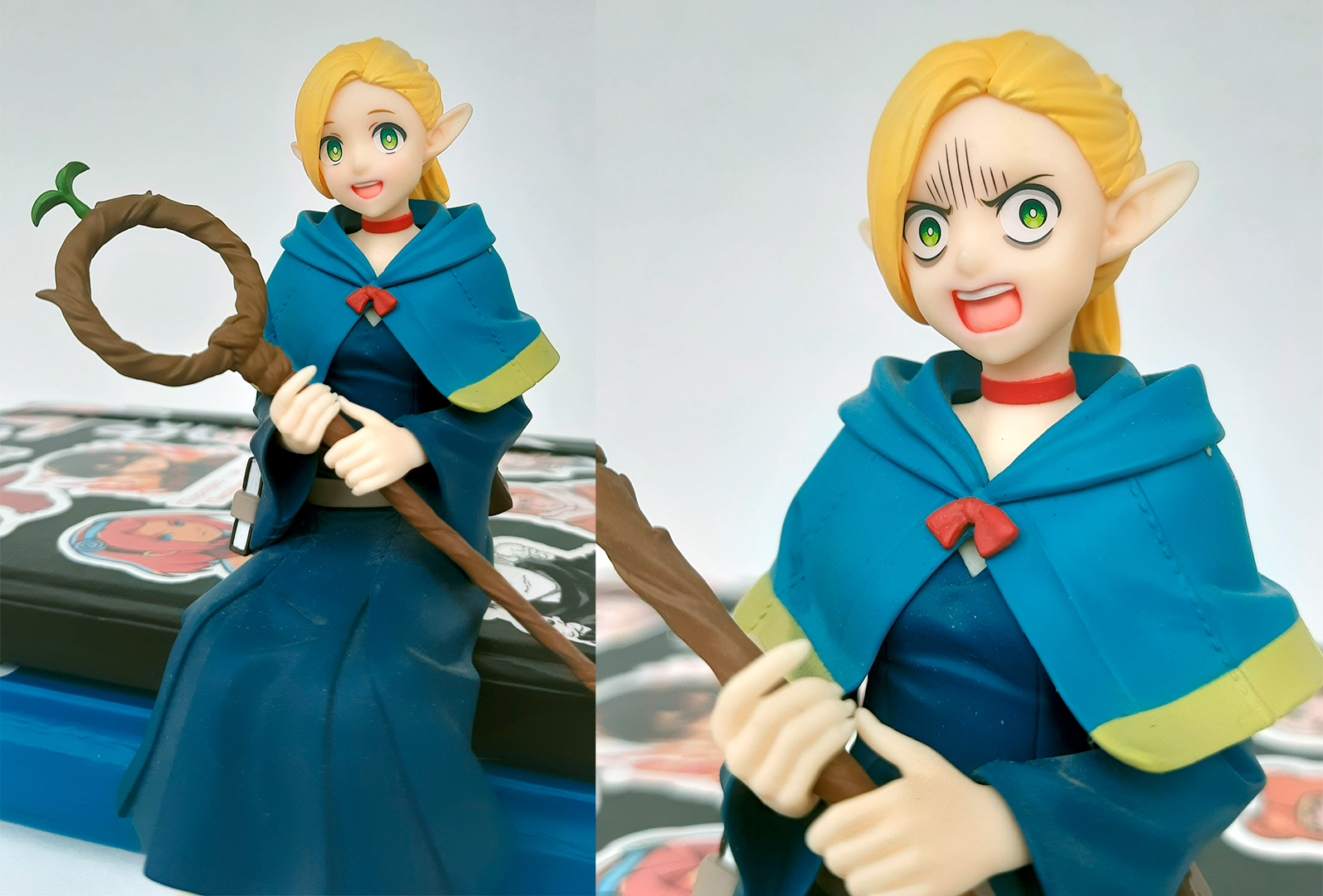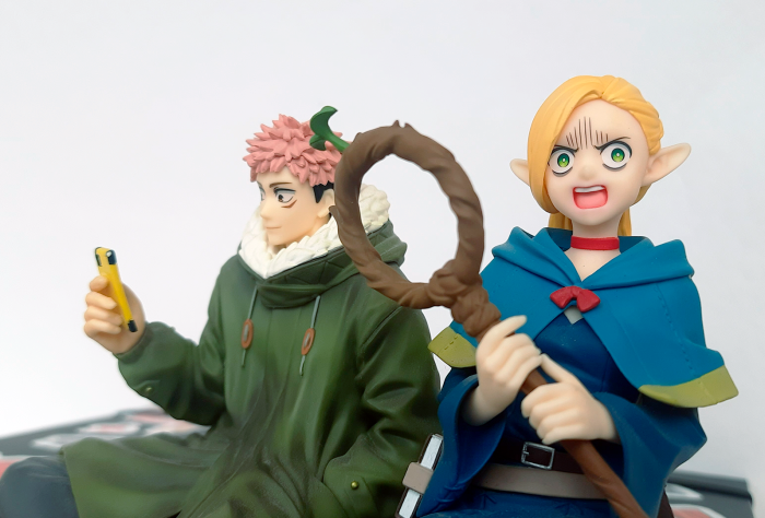 Не всем фигуркам без базы суждено стать «стопперами» — остальным достаточно быть просто милыми. Отдельного упоминания в категории It’s so freaking small заслуживают фигуроньки (иначе их не назовёшь) из линейки Manpuku Gochisousa Mascot. Не удержалась и купила сразу две — Изуцуми и Фалин из аниме Dungeon Meshi.