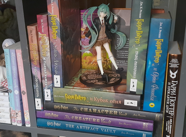 Также совершенно неожиданно в моих владениях появилась фигурка от Taito из их новой линейки под названием Hatsune Miku Fashion Series. А конкретно эта — Preppy — напомнила мне униформу Гриффиндора. За что заслуженно отправилась украшать соответствующую полку.