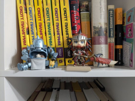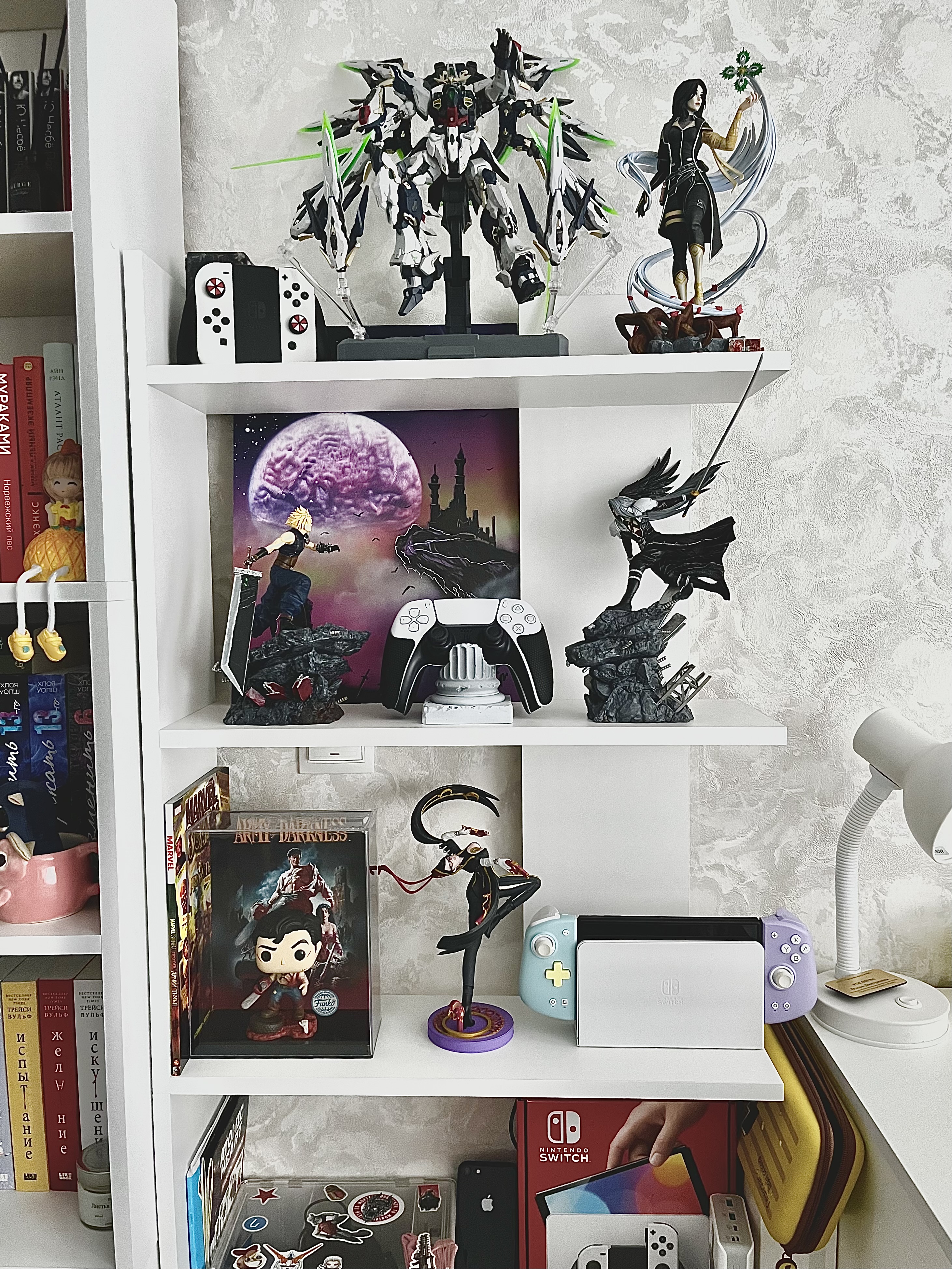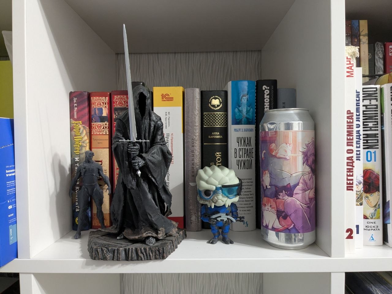 И заодно вспоминала о своей голубой мечте: превратить квартиру в уютную берлогу с тусклым освещением, тихой музыкой и тёплыми пледами, а ещё обзавестись полками, чтобы у моей коллекции были общие темы и даже цветовые палитры. Мечта потихоньку сбывается: теперь в моём жилище есть полки, посвященные любимым вселенным: Гарри Поттеру, Dragon Age, Far Cry, творчеству Джюнджи Ито и всяким хорошим аниме.